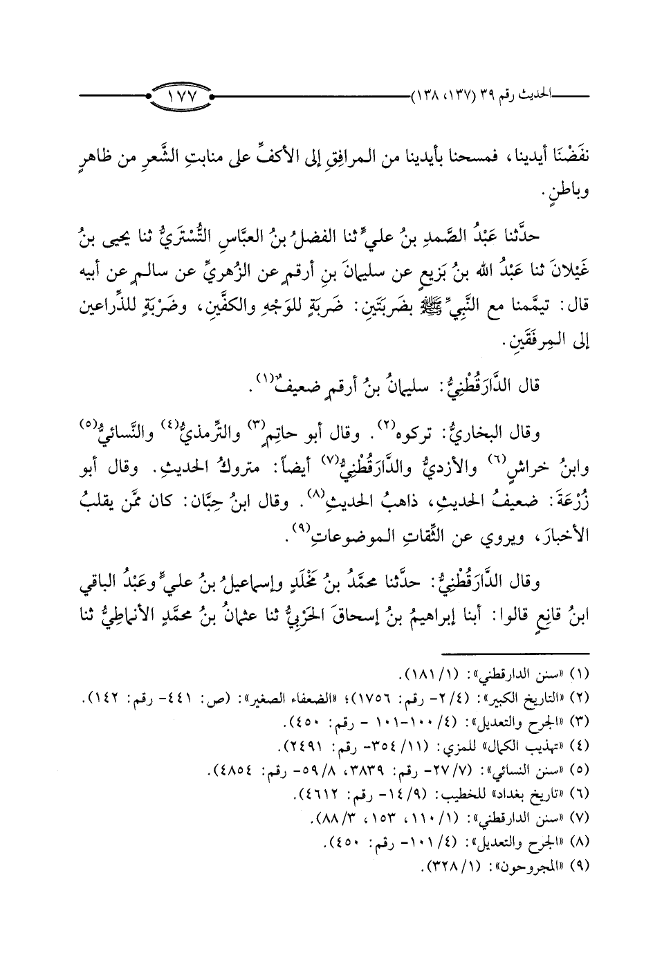قَالَ الدَّارَقُطْنِيُّ: سُلَيْمَانُ بْنُ أَرْقَمَ: ضَعِيفٌ.