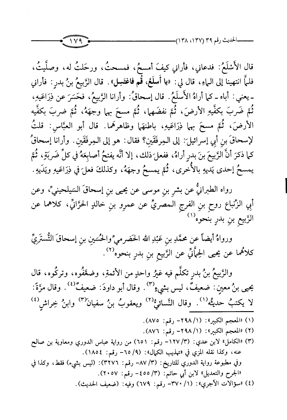 وَالرَّبِيعُ بْنُ بَدْرٍ تَكَلَّمَ فِيهِ غَيْرُ وَاحِدٍ مِنَ الأَئِمَّةِ وَضَعَّفُوهُ، وَتَرَكُوهُ، قَالَ يَحْيَى بْنُ مَعِينٍ: ضَعِيفٌ، لَيْسَ بِشَيْءٍ.