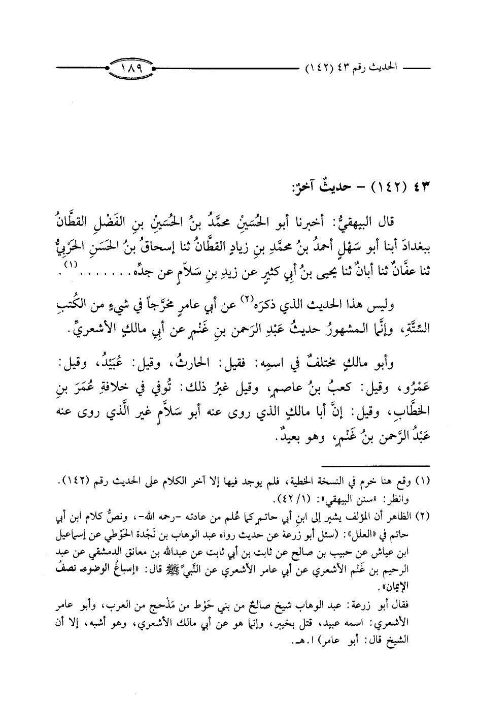 (142) - حَدِيثٌ آخَرُ: قَالَ الْبَيْهَقِيُّ: أَخْبَرَنَا أَبُو الْحُسَيْنِ مُحَمَّدُ بْنُ الْحُسَيْنِ بْنِ الْفَضْلِ الْقَطَّانُ بِبَغْدَادَ، أَبْنَا أَبُو سَهْلٍ أَحْمَدُ بْنُ مُحَمَّدِ بْنِ زِيَادٍ الْقَطَّانُ، ثَنَا إِسْحَاقُ بْنُ الْحَسَنِ الْحَرْبِيُّ، ثَنَا عَفَّانُ، ثَنَا أَبَانٌ، ثَنَا يَحْيَى بْنُ أَبِي كَثِيرٍ، عَنْ زَيْدِ بْنِ سَلَّامٍ، عَنْ جَدِّهِ،. . . . . . . . وَلَيْسَ هَذَا الْحَدِيثُ الَّذِي ذَكَرَهُ عَنْ أَبِي عَامِرٍ، مُخَرَّجًا فِي شَيْءٍ مِنَ الْكُتُبِ السِّتَّةِ، وَإِنَّمَا الْمَشْهُورُ حَدِيثُ عَبْدِ الرَّحْمَنِ بْنِ غَنْمٍ، عَنْ أَبِي مَالِكٍ الأَشْعَرِيِّ.