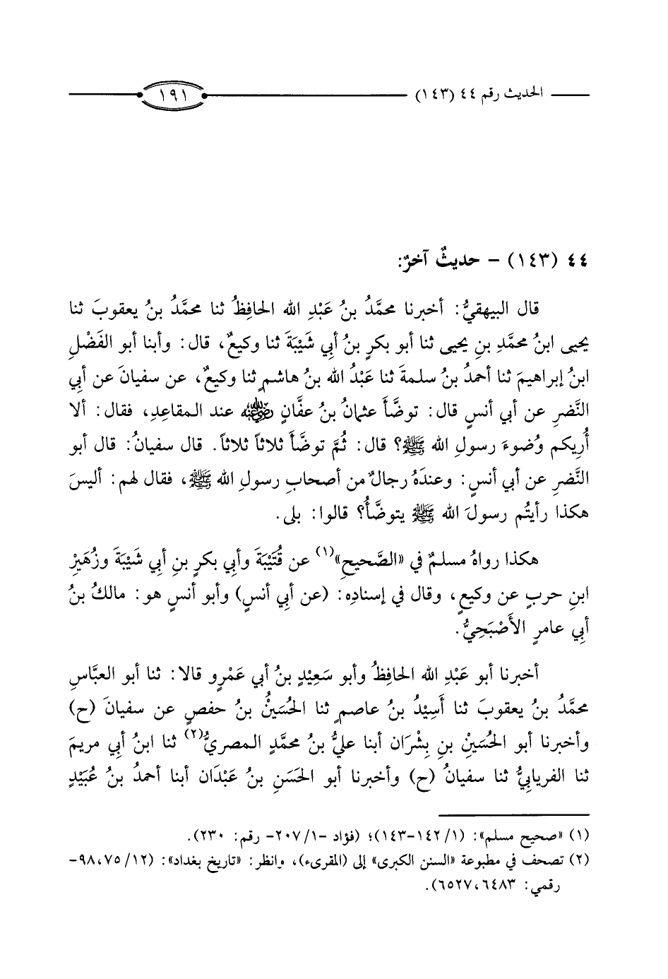 قَالَ الْبَيْهَقِيُّ: أَخْبَرَنَا مُحَمَّدُ بْنُ عَبْدِ اللَّهِ الْحَافِظُ، ثَنَا مُحَمَّدُ بْنُ يَعْقُوبَ، ثَنَا يَحْيَى بْنُ مُحَمَّدِ بْنِ يَحْيَى، ثَنَا أَبُو بَكْرِ بْنُ أَبِي شَيْبَةَ، ثَنَا وَكِيعٌ، قَالَ: وَأَبْنَا أَبُو الْفَضْلِ بْنُ إِبْرَاهِيمَ، ثَنَا أَحْمَدُ بْنُ سَلَمَةَ، ثَنَا عَبْدُ اللَّهِ بْنُ هَاشِمٍ، ثَنَا وَكِيعٌ، عَنْ سُفْيَانَ، عَنْ أَبِي النَّضْرِ، عَنْ أَبِي أَنَسٍ، قَالَ: تَوَضَّأَ عُثْمَانُ بْنُ عَفَّانَ رَضِيَ اللَّهُ عَنْهُ عِنْدَ الْمَقَاعِدِ، فَقَالَ: أَلا أُرِيكُمْ وُضُوءَ رَسُولِ اللَّهِ صَلَّى اللَّهُ عَلَيْهِ وَسَلَّمَ؟ قَالَ: ثُمَّ تَوَضَّأَ ثَلاثًا ثَلاثًا.