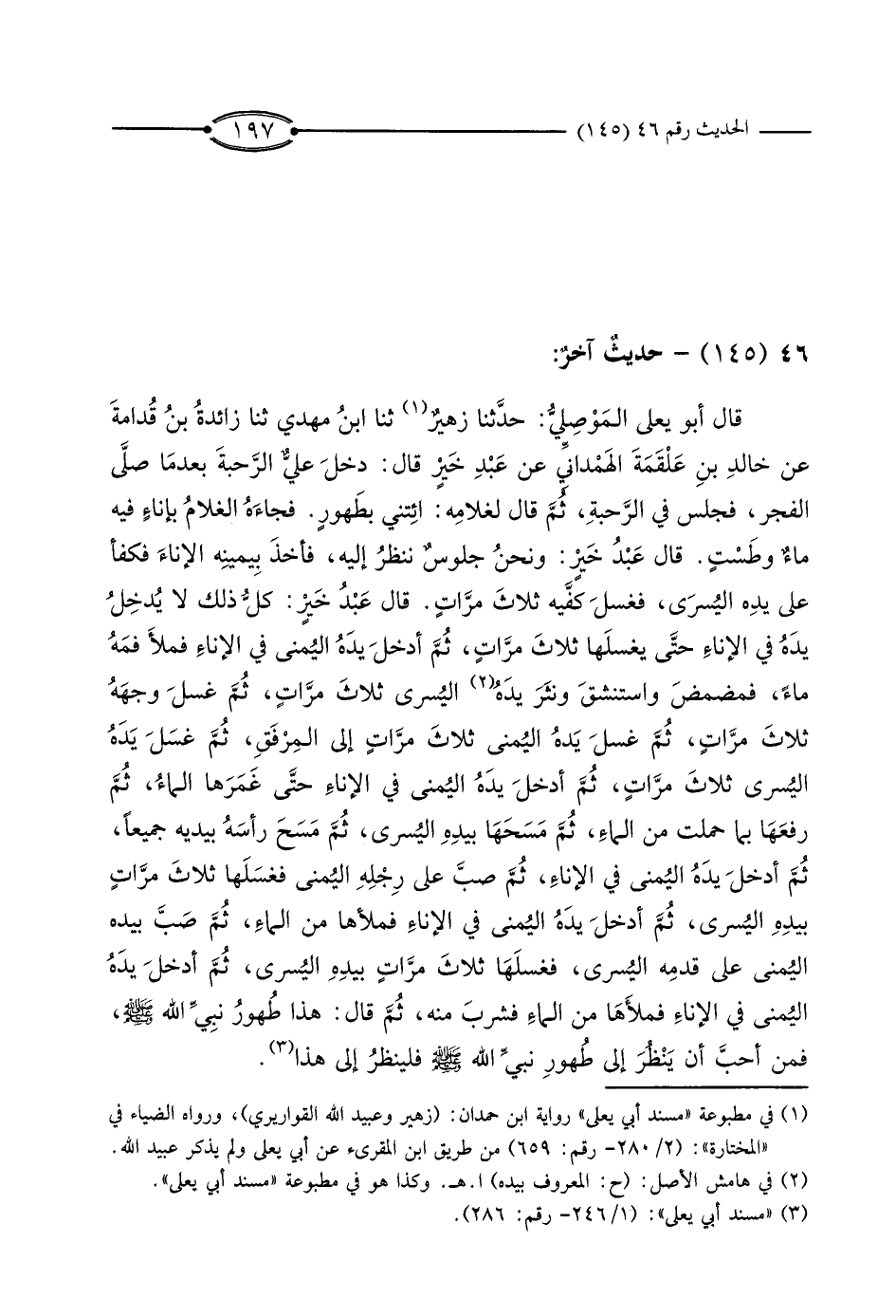 قَالَ أَبُو يَعْلَى الْمَوْصِلِيُّ: حَدَّثَنَا زُهَيْرٌ، ثَنَا ابْنُ مَهْدِيٍّ، ثَنَا زَائِدَةُ بْنُ قُدَامَةَ، عَنْ خَالِدِ بْنِ عَلْقَمَةَ الْهَمْدَانِيِّ، عَنْ عَبْدِ خَيْرٍ، قَالَ: دَخَلَ عَلِيٌّ الرَّحْبَةَ بَعْدَ مَا صَلَّى الْفَجْرَ، فَجَلَسَ فِي الرَّحْبَةِ، ثُمَّ قَالَ لِغُلامِهِ: ائْتِنِي بِطَهُورٍ.