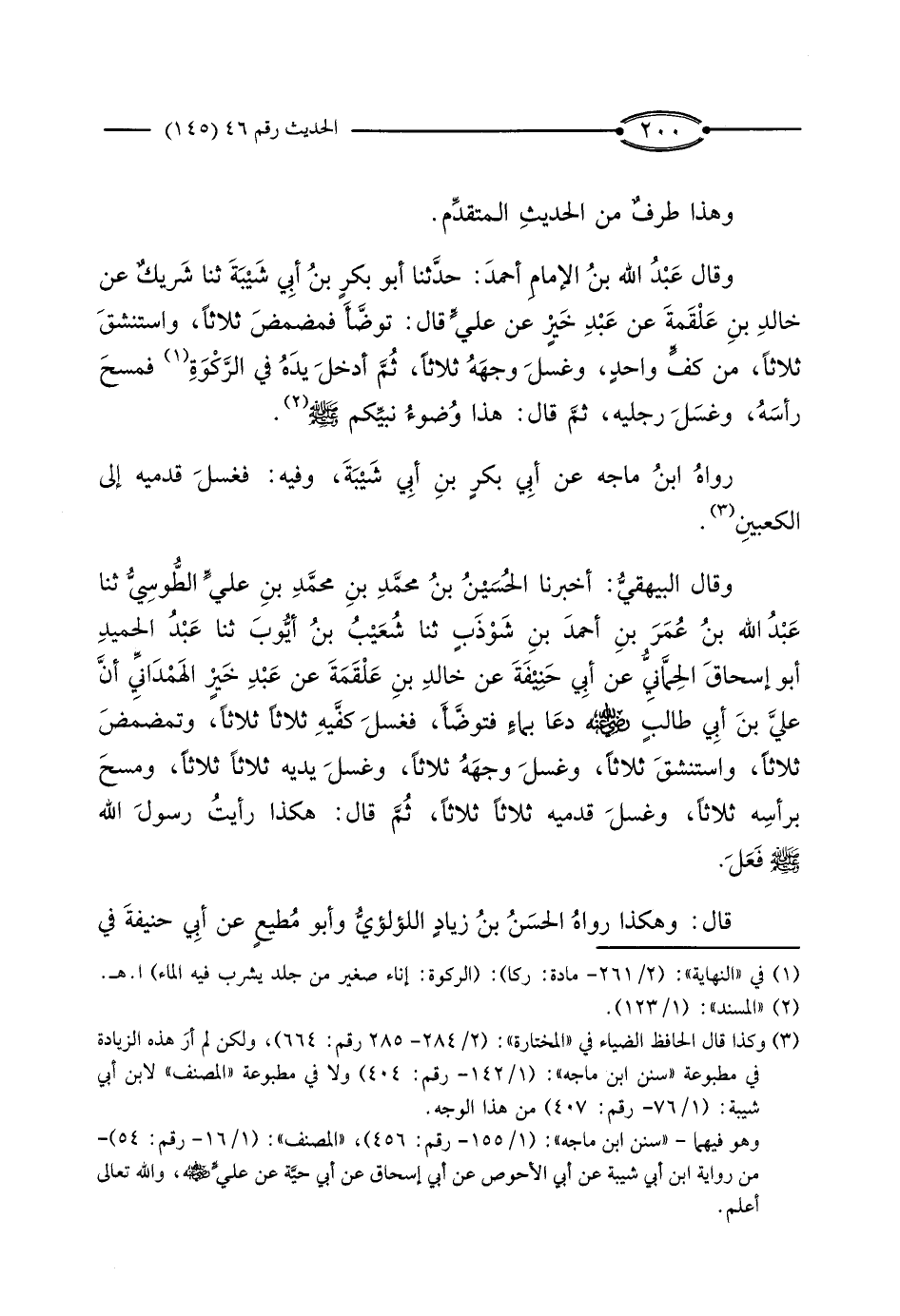 وَقَالَ عَبْدُ اللَّهِ بْنُ الإِمَامِ أَحْمَدَ: حَدَّثَنَا أَبُو بَكْرِ بْنُ أَبِي شَيْبَةَ، ثَنَا شَرِيكٌ، عَنْ خَالِدِ بْنِ عَلْقَمَةَ، عَنْ عَبْدِ خَيْرٍ، عَنْ عَلِيٍّ، قَالَ: تَوَضَّأَ فَمَضْمَضَ ثَلاثًا، وَاسْتَنْشَقَ ثَلاثًا مِنْ كَفٍّ وَاحِدٍ، وَغَسَلَ وَجْهَهُ ثَلاثًا، ثُمَّ أَدْخَلَ يَدَهُ فِي الرَّكْوَةِ فَمَسَحَ رَأْسَهُ، وَغَسَلَ رِجْلَيْهِ، ثُمَّ قَالَ: هَذَا وُضُوءُ نَبِيِّكُمْ صَلَّى اللَّهُ عَلَيْهِ وَسَلَّمَ.