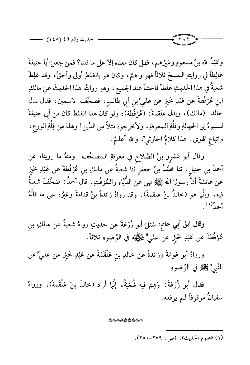 وَعَبْدُ اللَّهِ بْنُ مَسْعُودٍ وَغَيْرُهُمْ، فَهَلْ كَانَ مَعْنَاهُ إِلا عَلَى مَا قُلْنَا؟ فَمَنْ جَعَلَ أَبَا حَنِيفَةَ غَالِطًا فِي رِوَايَتِهِ الْمَسْحَ ثَلاثًا فَهُوَ وَاهِمٌ، وَكَانَ هُوَ بِالْغَلَطِ أَوْلَى وَأَحَقَّ، وَقَدْ غَلِطَ شُعْبَةُ فِي هَذَا الْحَدِيثِ غَلَطًا فَاحِشًا عِنْدَ الْجَمِيعِ، وَهُوَ رِوَايَتُهُ هَذَا الْحَدِيثَ، عَنْ مَالِكِ بْنِ عُرْفُطَةَ، عَنْ عَبْدِ خَيْرٍ، عَنْ عَلِيِّ بْنِ أَبِي طَالِبٍ، فَصَحَّفَ الاسْمَيْنِ فَقَالَ بَدَلَ خَالِدٍ: (مَالِكًا) وَبَدَلَ عَلْقَمَةَ: (عُرْفُطَةَ) ؛ وَلَوْ كَانَ هَذَا الْغَلَطُ، كَانَ مِنْ أَبِي حَنِيفَةَ لَنَسَبُوهُ إِلَى الْجَهَالَةِ وَقِلَّةِ الْمَعْرِفَةِ، وَلأَخْرَجُوهُ مَثَلا مِنَ الدِّينِ! وَهَذَا مِنْ قِلَّةِ الْوَرَعِ، وَاتِّبَاعِ الْهَوَى.