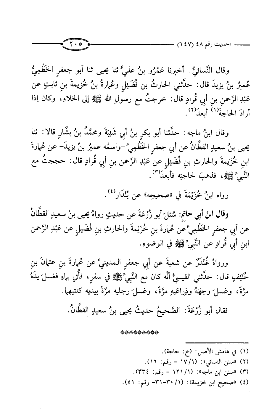 وَقَالَ ابْنُ مَاجَهْ: حَدَّثَنَا أَبُو بَكْرِ بْنُ أَبِي شَيْبَةَ، وَمُحَمَّدُ بْنُ بَشَّارٍ، قَالا: ثَنَا يَحْيَى بْنُ سَعِيدٍ الْقَطَّانُ، عَنْ أَبِي جَعْفَرٍ الْخَطْمِيِّ وَاسْمُهُ عُمَيْرُ بْنُ يَزِيدَ، عَنْ عُمَارَةَ بْنِ خُزَيْمَةَ، وَالْحَارِثِ بْنِ فُضَيْلٍ، عَنْ عَبْدِ الرَّحْمَنِ بْنِ أَبِي قُرَادٍ، قَالَ: حَجَجْتُ مَعَ النَّبِيِّ صَلَّى اللَّهُ عَلَيْهِ وَسَلَّمَ، فَذَهَبَ لِحَاجَتِهِ فَأَبْعَدَ.