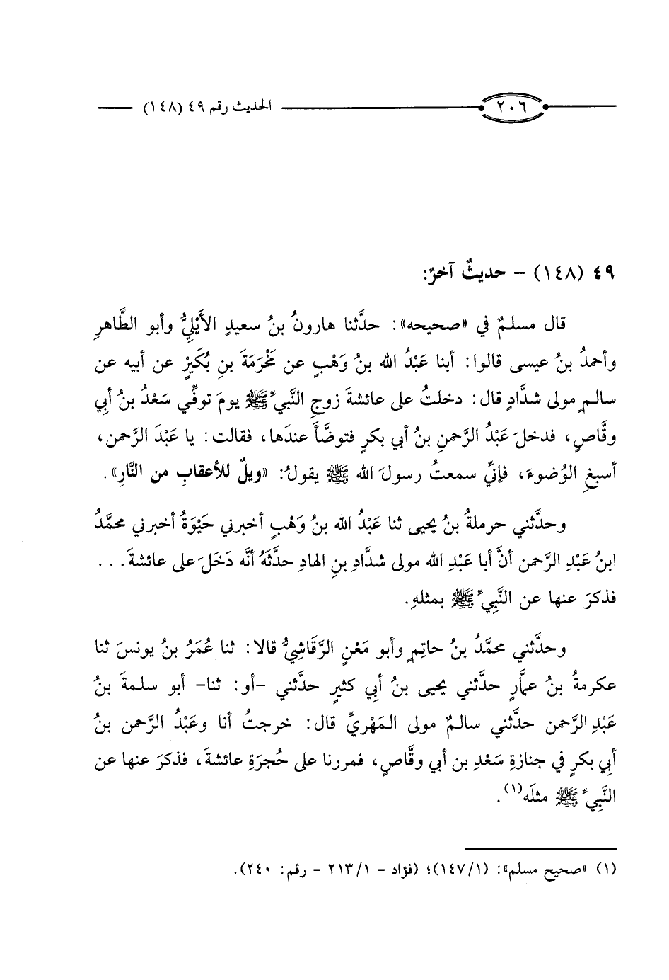قَالَ مُسْلِمٌ فِي «صَحِيحِهِ» : حَدَّثَنَا هَارُونُ بْنُ سَعِيدٍ الأَيْلِيُّ، وَأَبُو الطَّاهِرِ، وَأَحْمَدُ بْنُ عِيسَى، قَالُوا: أَبْنَا عَبْدُ اللَّهِ بْنُ وَهْبٍ، عَنْ مَخْرَمَةَ بْنِ بُكَيْرٍ، عَنْ أَبِيهِ، عَنْ سَالِمٍ مَوْلَى شَدَّادٍ، قَالَ: دَخَلْتُ عَلَى عَائِشَةَ زَوْجِ النَّبِيِّ صَلَّى اللَّهُ عَلَيْهِ وَسَلَّمَ يَوْمَ تُوُفِّيَ سَعْدُ بْنُ أَبِي وَقَّاصٍ، فَدَخَلَ عَبْدُ الرَّحْمَنِ بْنُ أَبِي بَكْرٍ فَتَوَضَّأَ عِنْدَهَا، فَقَالَتْ: يَا عَبْدَ الرَّحْمَنِ، أَسْبِغِ الْوُضُوءَ، فَإِنِّي سَمِعْتُ رَسُولَ اللَّهِ صَلَّى اللَّهُ عَلَيْهِ وَسَلَّمَ يَقُولُ: «وَيْلٌ لِلأَعْقَابِ مِنَ النَّارِ» .