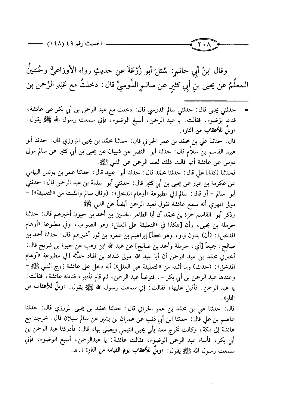 وَحَدَّثَنِي مُحَمَّدُ بْنُ حَاتِمٍ، وَأَبُو مَعْنٍ الرَّقَاشِيُّ، قَالا: ثَنَا عُمَرُ بْنُ يُونُسَ، ثَنَا عِكْرِمَةُ بْنُ عَمَّارٍ، حَدَّثَنِي يَحْيَى بْنُ أَبِي كَثِيرٍ، حَدَّثَنِي - أَوْ: ثَنَا - أَبُو سَلَمَةَ بْنُ عَبْدِ الرَّحْمَنِ، حَدَّثَنِي سَالِمٌ مَوْلَى الْمَهْرِيِّ، قَالَ: خَرَجْتُ أَنَا وَعَبْدُ الرَّحْمَنِ بْنُ