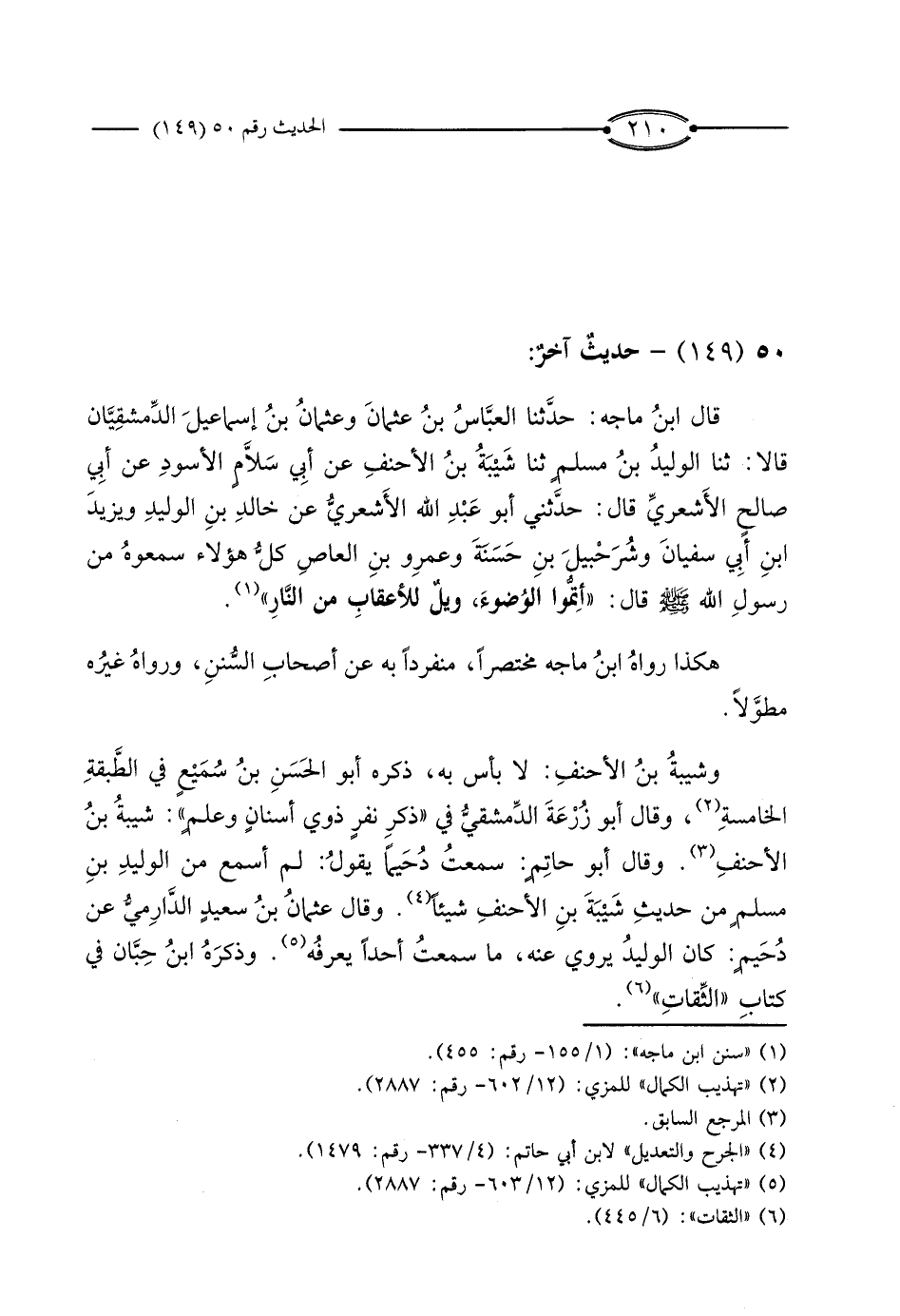 قَالَ ابْنُ مَاجَهْ: حَدَّثَنَا الْعَبَّاسُ بْنُ عُثْمَانَ، وَعُثْمَانُ بْنُ إِسْمَاعِيلَ الدِّمَشْقِيَّانِ، قَالا: ثَنَا الْوَلِيدُ بْنُ مُسْلِمٍ، ثَنَا شَيْبَةُ بْنُ الأَحْنَفِ، عَنْ أَبِي سَلَّامٍ الأَسْوَدِ، عَنْ أَبِي صَالِحٍ الأَشْعَرِيِّ، قَالَ: حَدَّثَنِي أَبُو عَبْدِ اللَّهِ الأَشْعَرِيُّ، عَنْ خَالِدِ بْنِ الْوَلِيدِ، وَيَزِيدَ بْنِ أَبِي سُفْيَانَ، وَشُرَحْبِيلَ بْنِ حَسَنَةَ، وَعَمْرِو بْنِ الْعَاصِ، كُلُّ هَؤُلاءِ سَمِعُوهُ مِنْ رَسُولِ اللَّهِ صَلَّى اللَّهُ عَلَيْهِ وَسَلَّمَ قَالَ: «أَتِمُّوا الْوُضُوءَ، وَيْلٌ لِلأَعْقَابِ مِنَ النَّارِ» .