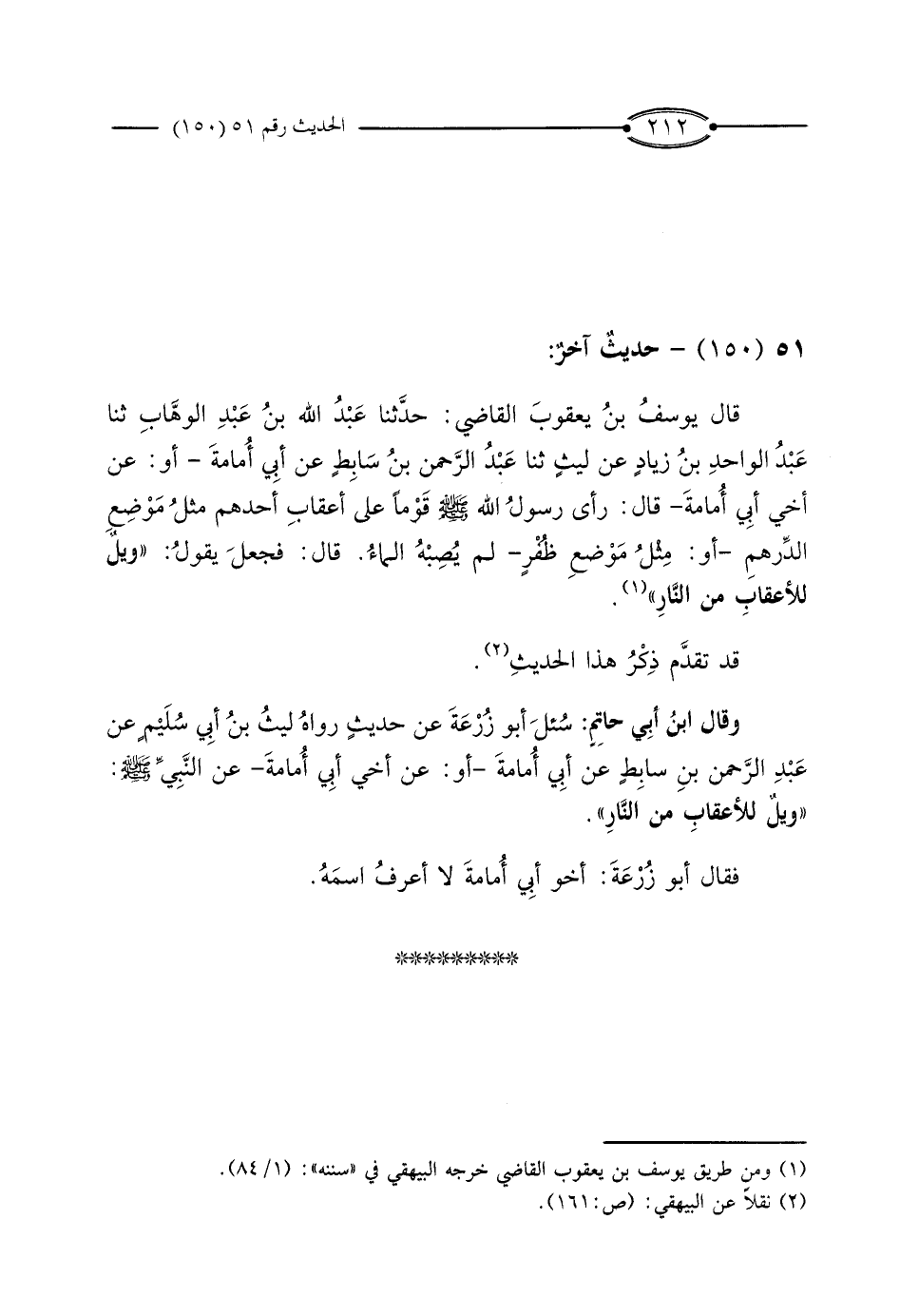 قَالَ يُوسُفُ بْنُ يَعْقُوبَ الْقَاضِي: حَدَّثَنَا عَبْدُ اللَّهِ بْنُ عَبْدِ الْوَهَّابِ، ثَنَا عَبْدُ الْوَاحِدِ بْنُ زِيَادٍ، عَنْ لَيْثٍ، ثَنَا عَبْدُ الرَّحْمَنِ بْنُ سَابِطٍ، عَنْ أَبِي أُمَامَةَ - أَوْ: عَنْ أَخِي أَبِي أُمَامَةَ - قَالَ: رَأَى رَسُولُ اللَّهِ صَلَّى اللَّهُ عَلَيْهِ وَسَلَّمَ قَوْمًا عَلَى أَعْقَابِ أَحَدِهِمْ مِثْلُ مَوْضِعِ الدِّرْهَمِ - أَوْ: مِثْلُ مَوْضِعِ ظُفْرٍ - لَمْ يُصِبْهُ الْمَاءُ.