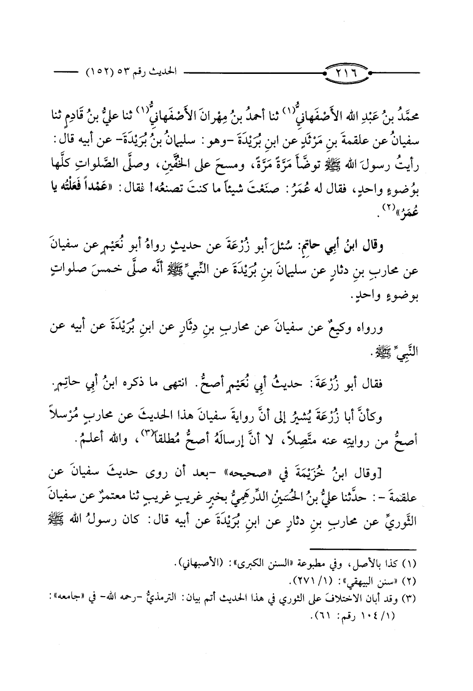 مُحَمَّدُ بْنُ عَبْدِ اللَّهِ الأَصْفَهَانِيُّ، ثَنَا أَحْمَدُ بْنُ مِهْرَانَ الأَصْفَهَانِيُّ، ثَنَا عَلِيُّ بْنُ قَادِمٍ، ثَنَا سُفْيَانُ، عَنْ عَلْقَمَةَ بْنِ مَرْثَدٍ، عَنْ ابْنِ بُرَيْدَةَ - وَهُوَ: سُلَيْمَانُ بْنُ بُرَيْدَةَ -، عَنْ أَبِيهِ، قَالَ: رَأَيْتُ رَسُولَ اللَّهِ صَلَّى اللَّهُ عَلَيْهِ وَسَلَّمَ تَوَضَّأَ مَرَّةً مَرَّةً، وَمَسَحَ عَلَى الْخُفَّيْنِ، وَصَلَّى الصَّلَوَاتِ كُلَّهَا بِوُضُوءٍ وَاحِدٍ، فَقَالَ لَهُ عُمَرُ: صَنَعْتَ شَيْئًا مَا كُنْتَ تَصْنَعُهُ! فَقَالَ: «عَمْدًا فَعَلْتُهُ يَا عُمَرُ» .