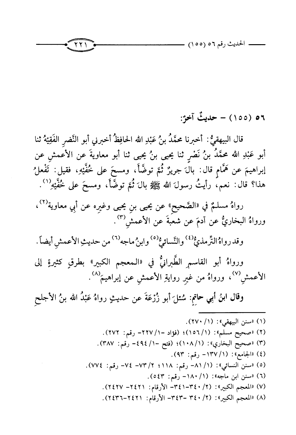 قَالَ الْبَيْهَقِيُّ: أَخْبَرَنَا مُحَمَّدُ بْنُ عَبْدِ اللَّهِ الْحَافِظُ، أَخْبَرَنِي أَبُو النَّضْرِ الْفَقِيهُ، ثَنَا أَبُو عَبْدِ اللَّهِ مُحَمَّدُ بْنُ نَصْرٍ، ثَنَا يَحْيَى بْنُ يَحْيَى، ثَنَا أَبُو مُعَاوِيَةَ، عَنْ الأَعْمَشِ، عَنْ إِبْرَاهِيمَ، عَنْ هَمَّامٍ، قَالَ: بَالَ جَرِيرٌ ثُمَّ تَوَضَّأَ، وَمَسَحَ عَلَى خُفَّيْهِ، فَقِيلَ: تَفْعَلُ هَذَا؟ قَالَ: نَعَمْ، رَأَيْتُ رَسُولَ اللَّهِ صَلَّى اللَّهُ عَلَيْهِ وَسَلَّمَ بَالَ ثُمَّ تَوَضَّأَ، وَمَسَحَ عَلَى خُفَّيْهِ.