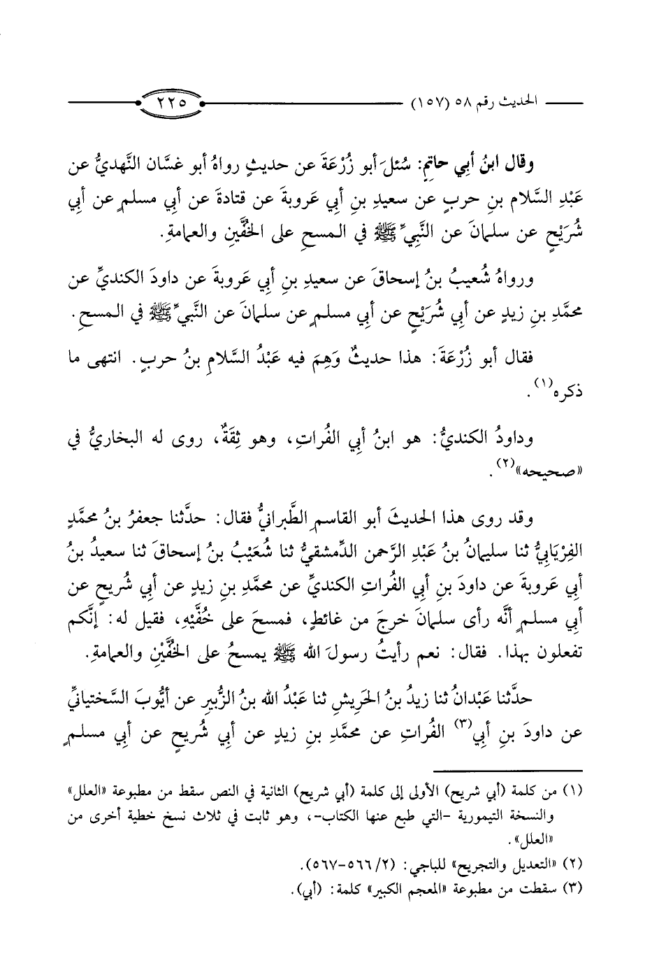 وَقَالَ ابْنُ أَبِي حَاتِمٍ: سُئِلَ أَبُو زُرْعَةَ، عَنْ حَدِيثٍ رَوَاهُ أَبُو غَسَّانَ النَّهْدِيُّ، عَنْ عَبْدِ السَّلامِ بْنِ حَرْبٍ، عَنْ سَعِيدِ بْنِ أَبِي عَرُوبَةَ، عَنْ قَتَادَةَ، عَنْ أَبِي مُسْلِمٍ، عَنْ أَبِي شُرَيْحٍ، عَنْ سَلْمَانَ، عَنِ النَّبِيِّ صَلَّى اللَّهُ عَلَيْهِ وَسَلَّمَ فِي الْمَسْحِ عَلَى الْخُفَّيْنِ وَالْعِمَامَةِ.