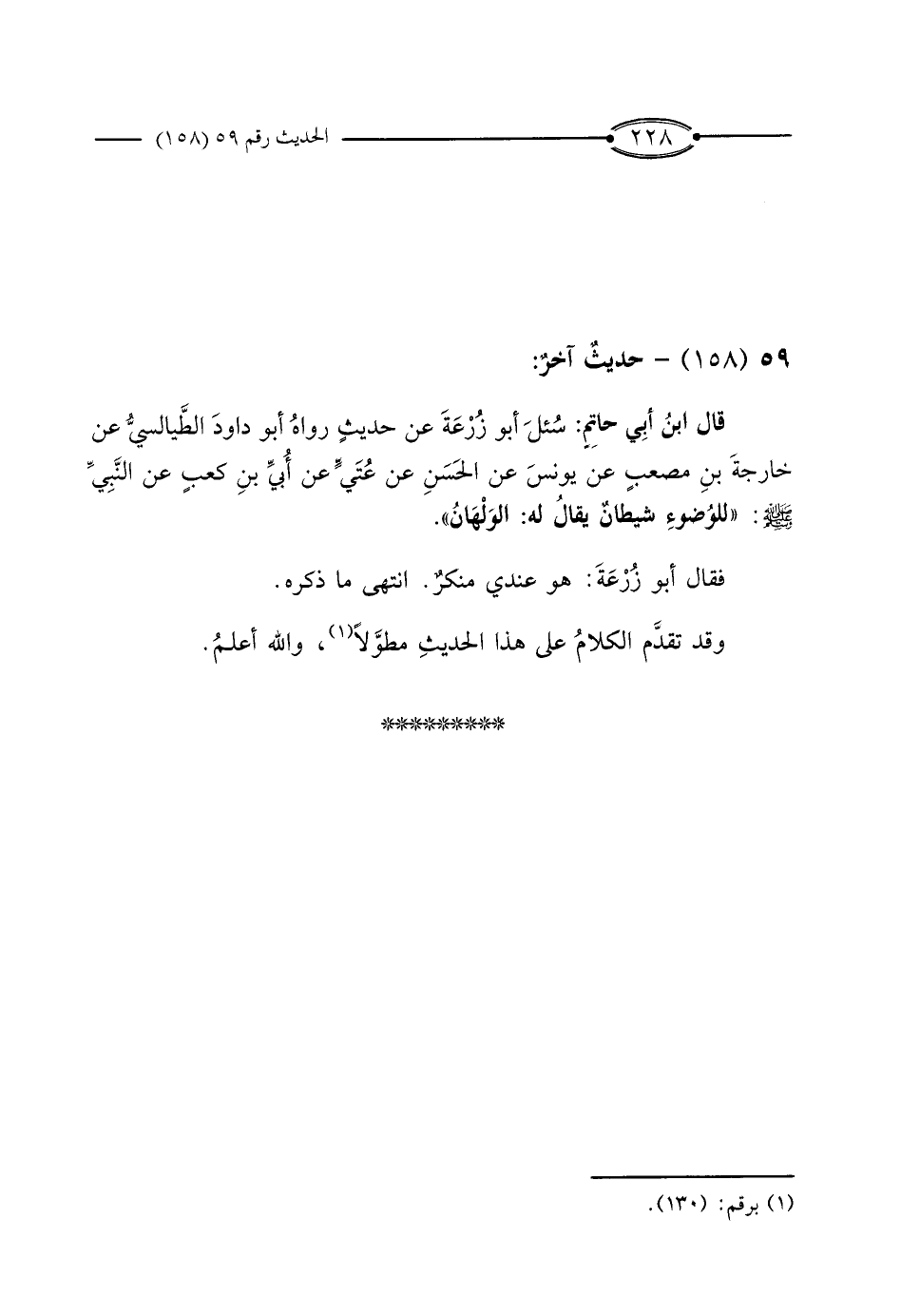 قَالَ ابْنُ أَبِي حَاتِمٍ: سُئِلَ أَبُو زُرْعَةَ، عَنْ حَدِيثٍ رَوَاهُ أَبُو دَاوُدَ الطَّيَالِسِيُّ، عَنْ خَارِجَةَ بْنِ مُصْعَبٍ، عَنْ يُونُسَ، عَنْ الْحَسَنِ، عَنْ عُتَيٍّ، عَنْ أُبَيِّ بْنِ كَعْبٍ، عَنِ النَّبِيِّ صَلَّى اللَّهُ عَلَيْهِ وَسَلَّمَ: " لِلْوُضُوءِ شَيْطَانٌ يُقَالُ لَهُ: الْوَلَهَانُ ".