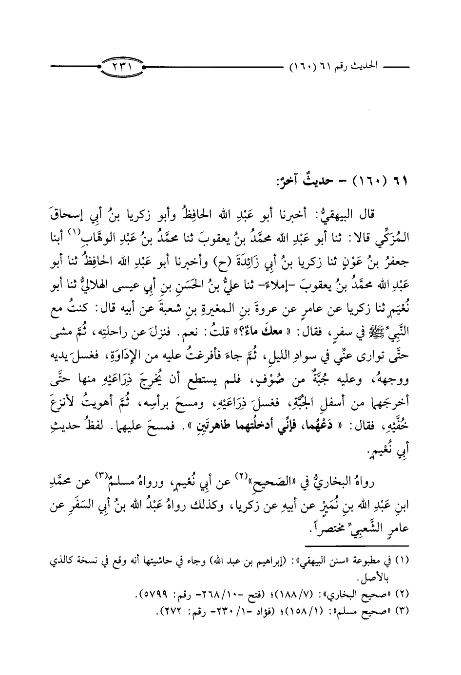 قَالَ الْبَيْهَقِيُّ: أَخْبَرَنَا أَبُو عَبْدِ اللَّهِ الْحَافِظُ، وَأَبُو زَكَرِيَّا بْنُ أَبِي إِسْحَاقَ الْمُزَكِّيُّ، قَالا: ثَنَا أَبُو عَبْدِ اللَّهِ مُحَمَّدُ بْنُ يَعْقُوبَ، ثَنَا مُحَمَّدُ بْنُ عَبْدِ الْوَهَّابِ، أَبْنَا جَعْفَرُ بْنُ عَوْنٍ، ثَنَا زَكَرِيَّا بْنُ أَبِي زَائِدَةَ، (ح) وَأَخْبَرَنَا أَبُو عَبْدِ اللَّهِ الْحَافِظُ، ثَنَا أَبُو عَبْدِ اللَّهِ مُحَمَّدُ بْنُ يَعْقُوبَ إِمْلاءً، ثَنَا عَلِيُّ بْنُ الْحَسَنِ بْنِ أَبِي عِيسَى الْهِلالِيُّ، ثَنَا أَبُو نُعَيْمٍ، ثَنَا زَكَرِيَّا، عَنْ عَامِرٍ، عَنْ عُرْوَةَ بْنِ الْمُغِيرَةِ بْنِ شُعْبَةَ، عَنْ أَبِيهِ، قَالَ: كُنْتُ مَعَ النَّبِيِّ صَلَّى اللَّهُ عَلَيْهِ وَسَلَّمَ فِي سَفَرٍ، فَقَالَ: «مَعَكَ مَاءٌ؟» قُلْتُ: نَعَمْ.