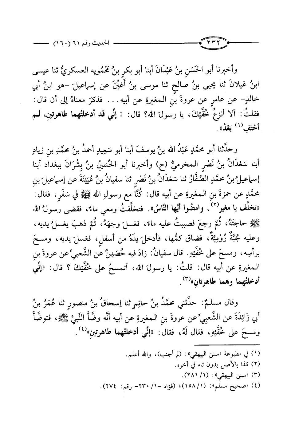 وَأَخْبَرَنَا أَبُو الْحَسَنِ بْنُ عَبْدَانَ، أَبْنَا أَبُو بَكْرِ بْنُ مَحْمُوَيْهِ الْعَسْكَرِيُّ، ثَنَا عِيسَى بْنُ غَيْلانَ، ثَنَا يَحْيَى بْنُ صَالِحٍ، ثَنَا مُوسَى بْنُ أَعْيُنَ، عَنْ إِسْمَاعِيلَ هُوَ ابْنُ أَبِي خَالِدٍ، عَنْ عَامِرٍ، عَنْ عُرْوَةَ بْنِ الْمُغِيرَةِ، عَنْ أَبِيهِ. . . فَذَكَرَ مَعْنَاهُ إِلَى أَنْ قَالَ: فَقُلْتُ: أَلا أَنْزِعُ خُفَّيْكَ يَا رَسُولَ اللَّهِ: قَالَ: إِنِّي قَدْ أَدْخَلْتُهُمَا طَاهِرَتَيْنِ، لَمْ أَحْتَفِ بَعْدُ ".