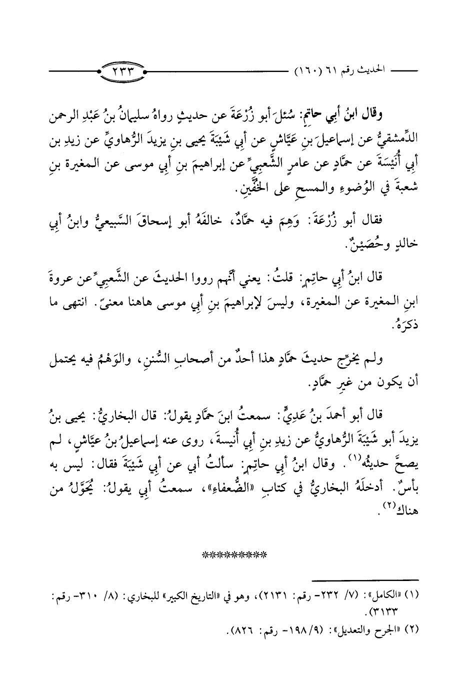 قَالَ ابْنُ أَبِي حَاتِمٍ: سُئِلَ أَبُو زُرْعَةَ، عَنْ حَدِيثٍ رَوَاهُ سُلَيْمَانُ بْنُ عَبْدِ الرَّحْمَنِ الدِّمَشْقِيُّ، عَنْ إِسْمَاعِيلَ بْنِ عَيَّاشٍ، عَنْ أَبِي شَيْبَةَ يَحْيَى بْنِ يَزِيدَ الرُّهَاوِيِّ، عَنْ زَيْدِ بْنِ أَبِي أُنَيْسَةَ، عَنْ حَمَّادٍ، عَنْ عَامِرٍ الشَّعْبِيِّ، عَنْ إِبْرَاهِيمَ بْنِ أَبِي مُوسَى، عَنْ الْمُغِيرَةِ بْنِ شُعْبَةَ، فِي الْوُضُوءِ وَالْمَسْحِ عَلَى الْخُفَّيْنِ.