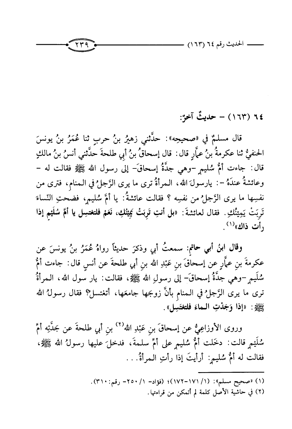 قَالَ مُسْلِمٌ فِي «صَحِيحِهِ» : حَدَّثَنِي زُهَيْرُ بْنُ حَرْبٍ، ثَنَا عُمَرُ بْنُ يُونُسَ الْحَنَفِيُّ، ثَنَا عِكْرِمَةُ بْنُ عَمَّارٍ، قَالَ: قَالَ إِسْحَاقُ بْنُ أَبِي طَلْحَةَ، حَدَّثَنِي أَنَسُ بْنُ مَالِكٍ، قَالَ: جَاءَتْ أُمُّ سُلَيْمٍ وَهِيَ جَدَّةُ إِسْحَاقَ إِلَى رَسُولِ اللَّهِ صَلَّى اللَّهُ عَلَيْهِ وَسَلَّمَ فَقَالَتْ لَهُ وَعَائِشَةُ عِنْدَهُ: يَا رَسُولَ اللَّهِ، الْمَرْأَةُ تَرَى مَا يَرَى الرَّجُلُ فِي الْمَنَامِ، فَتَرَى مِنْ نَفْسِهَا مَا يَرَى الرَّجُلُ مِنْ نَفْسِهِ؟ فَقَالَتْ عَائِشَةُ: يَا أُمَّ سُلَيْمٍ، فَضَحْتِ النِّسَاءَ تَرِبَتْ يَمِينُكِ.