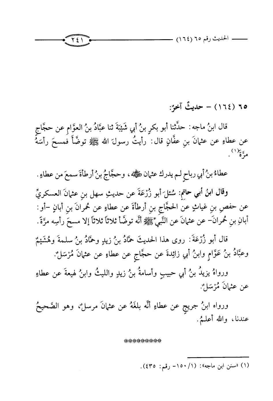 قَالَ أَبُو زُرْعَةَ: رَوَى هَذَا الْحَدِيثَ حَمَّادُ بْنُ زَيْدٍ، وَحَمَّادُ بْنُ سَلَمَةَ، وَهُشَيْمٌ، وَعَبَّادُ بْنُ عَوَّامٍ، وَابْنُ أَبِي زَائِدَةَ، عَنْ حَجَّاجٍ، عَنْ عَطَاءٍ، عَنْ عُثْمَانَ، مُرْسَلٌ.