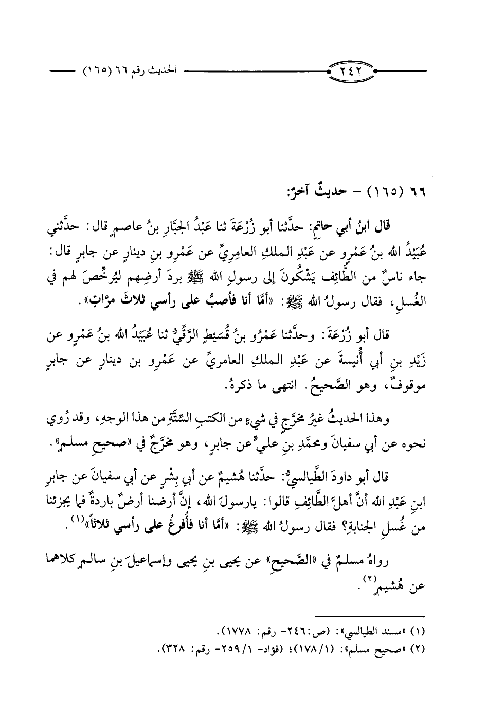 قَالَ ابْنُ أَبِي حَاتِمٍ: حَدَّثَنَا أَبُو زُرْعَةَ، ثَنَا عَبْدُ الْجَبَّارِ بْنُ عَاصِمٍ، قَالَ: حَدَّثَنِي عُبَيْدُ اللَّهِ بْنُ عَمْرٍو، عَنْ عَبْدِ الْمَلِكِ الْعَامِرِيِّ، عَنْ عَمْرِو بْنِ دِينَارٍ، عَنْ جَابِرٍ، قَالَ: جَاءَ نَاسٌ مِنَ الطَّائِفِ يَشْكُونَ إِلَى رَسُولِ اللَّهِ صَلَّى اللَّهُ عَلَيْهِ وَسَلَّمَ بَرْدَ أَرْضِهِمْ لِيُرَخِّصَ لَهُمْ فِي الْغُسْلِ، فَقَالَ رَسُولُ اللَّهِ صَلَّى اللَّهُ عَلَيْهِ وَسَلَّمَ: «أَمَّا أَنَا فَأَصُبُّ عَلَى رَأْسِي ثَلاثَ مَرَّاتٍ» .