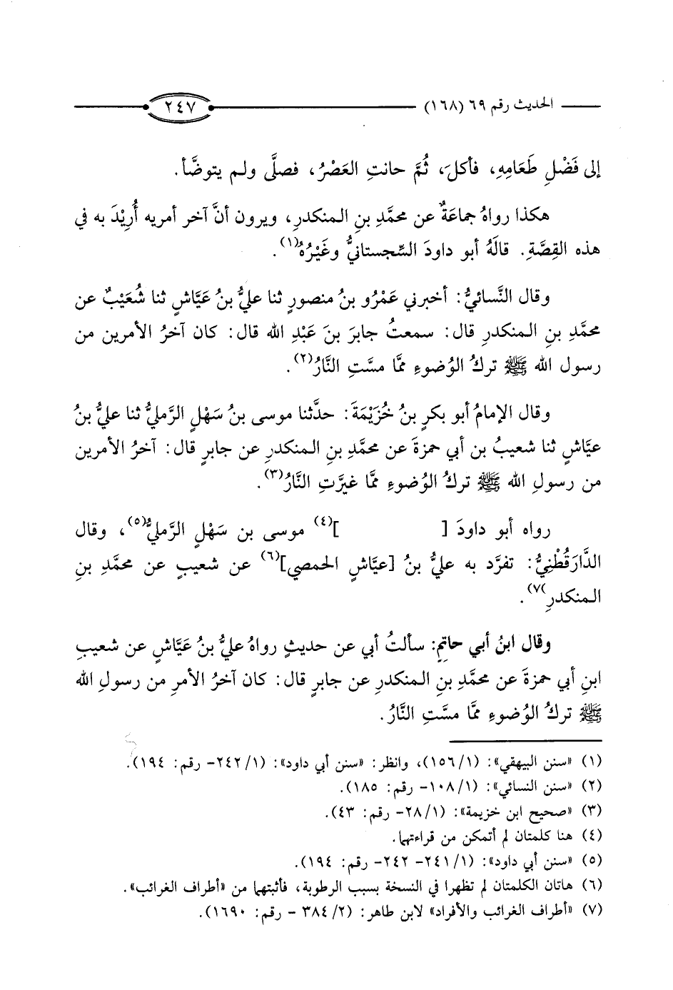 وَقَالَ النِّسَائِيُّ: أَخْبَرَنِي عَمْرُو بْنُ مَنْصُورٍ، ثَنَا عَلِيُّ بْنُ عَيَّاشٍ، ثَنَا شُعَيْبُ، عَنْ مُحَمَّدِ بْنِ الْمُنْكَدِرِ، قَالَ: سَمِعْتُ جَابِرَ بْنَ عَبْدِ اللَّهِ، قَالَ: كَانَ آخِرُ الأَمْرَيْنِ مِنْ رَسُولِ اللَّهِ صَلَّى اللَّهُ عَلَيْهِ وَسَلَّمَ تَرْكُ الْوُضُوءِ مِمَّا مَسَّتِ النَّارُ.
