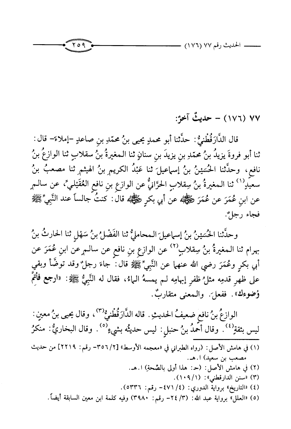 قَالَ الدَّارَقُطْنِيُّ: حَدَّثَنَا أَبُو مُحَمَّدٍ يَحْيَى بْنُ مُحَمَّدِ بْنِ صَاعِدٍ إِمْلاءً، قَالَ: ثَنَا أَبُو فَرْوَةَ يَزِيدُ بْنُ مُحَمَّدِ بْنِ يَزِيدَ بْنِ سِنَانٍ، ثَنَا الْمُغِيرَةُ بْنُ سِقْلابٍ، ثَنَا الْوَازِعُ بْنُ نَافِعٍ، وَحَدَّثَنَا الْحُسَيْنُ بْنُ إِسْمَاعِيلَ، ثَنَا عَبْدُ الْكَرِيمِ بْنُ الْهَيْثَمِ، ثَنَا مُصْعَبُ بْنُ سَعِيدٍ، ثَنَا الْمُغِيرَةُ بْنُ سِقْلابٍ الْحَرَّانِيُّ، عَنْ الْوَازِعِ بْنِ نَافِعٍ الْعُقَيْلِيِّ، عَنْ سَالِمٍ، عَنْ ابْنِ عُمَرَ، عَنْ عُمَرَ رَضِيَ اللَّهُ عَنْهُ، عَنْ أَبِي بَكْرٍ رَضِيَ اللَّهُ عَنْهُ قَالَ: كُنْتُ جَالِسًا عِنْدَ النَّبِيِّ صَلَّى اللَّهُ عَلَيْهِ وَسَلَّمَ فَجَاءَ رَجُلٌ.