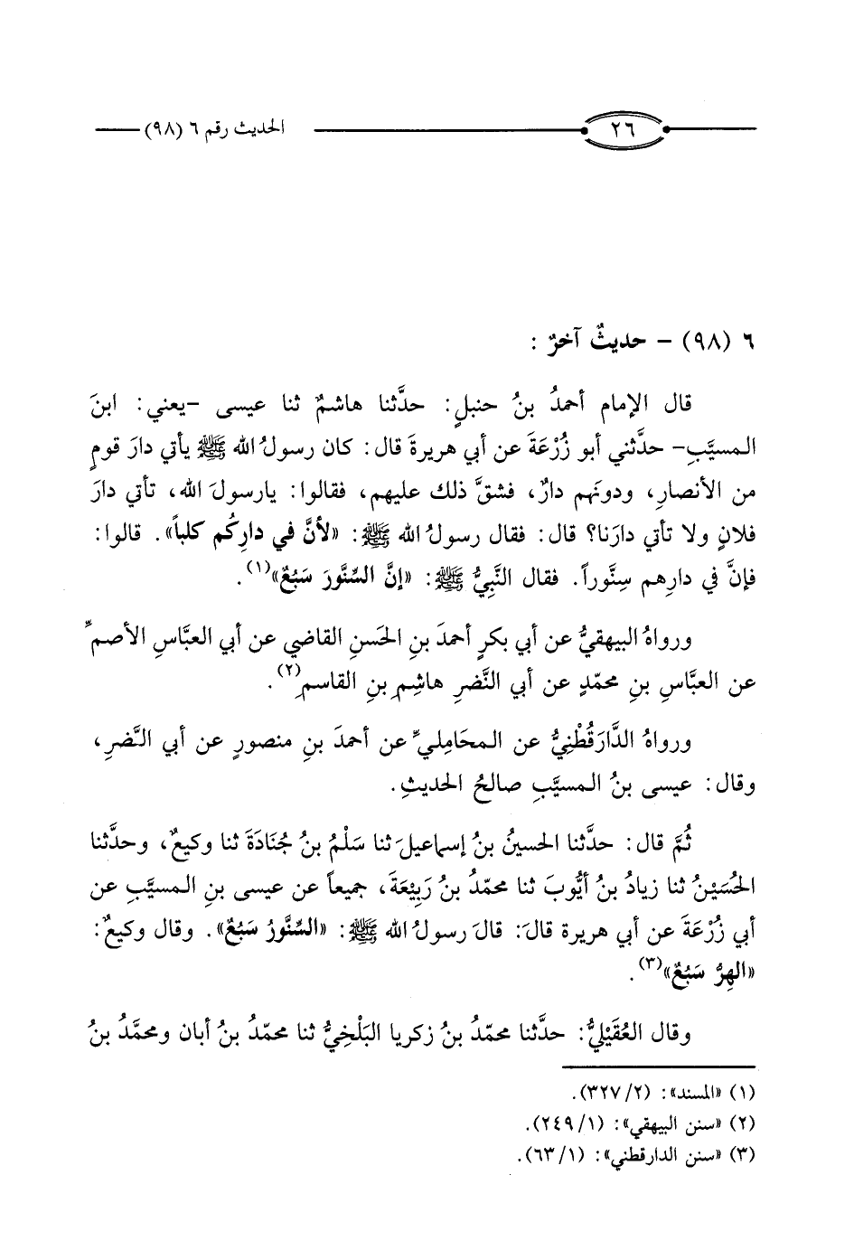 قَالَ الإِمَامُ أَحْمَدُ بْنُ حَنْبَلٍ: حَدَّثَنَا هَاشِمٌ، ثَنَا عِيسَى - يَعْنِي: ابْنَ الْمُسَيِّبِ -، حَدَّثَنِي أَبُو زُرْعَةَ، عَنْ أَبِي هُرَيْرَةَ، قَالَ: كَانَ رَسُولُ اللَّهِ صَلَّى اللَّهُ عَلَيْهِ وَسَلَّمَ يَأْتِي دَارَ قَوْمٍ مِنَ الأَنْصَارِ، وَدُونَهُمْ دَارٌ، فَشُقَّ ذَلِكَ عَلَيْهِمْ، فَقَالُوا: يَا رَسُولَ اللَّهِ، تَأْتِي دَارَ فُلانٍ وَلا تَأْتِي دَارَنَا؟ قَالَ: فَقَالَ رَسُولُ اللَّهِ صَلَّى اللَّهُ عَلَيْهِ وَسَلَّمَ: «لأَنَّ فِي دَارِكُمْ كَلْبًا» .