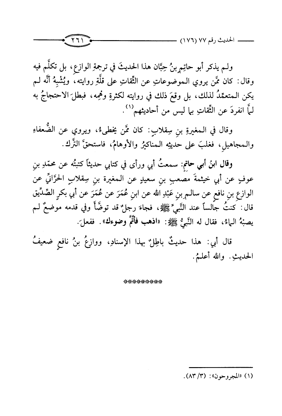 وَقَالَ ابْنُ أَبِي حَاتِمٍ: سَمِعْتُ أَبِي وَرَأَى فِي كِتَابِي حَدِيثًا كَتَبْتُهُ عَنْ مُحَمَّدِ بْنِ عَوْفٍ، عَنْ أَبِي خَيْثَمَةَ مُصْعَبِ بْنِ سَعِيدٍ، عَنْ الْمُغِيرَةِ بْنِ سِقْلابٍ الْحَرَّانِيِّ، عَنْ الْوَازِعِ بْنِ نَافِعٍ، عَنْ سَالِمِ بْنِ عَبْدِ اللَّهِ، عَنْ ابْنِ عُمَرَ، عَنْ عُمَرَ، عَنْ أَبِي بَكْرٍ الصِّدِّيقِ قَالَ: كُنْتُ جَالِسًا عِنْدَ النَّبِيِّ صَلَّى اللَّهُ عَلَيْهِ وَسَلَّمَ، فَجَاءَ رَجُلٌ قَدْ تَوَضَّأَ وَفِي قَدَمِهِ مَوْضِعٌ لَمْ يُصِبْهُ الْمَاءُ، فَقَالَ لَهُ النَّبِيُّ صَلَّى اللَّهُ عَلَيْهِ وَسَلَّمَ: «اذْهَبْ فَأَتِمَّ وُضُوءَكَ» .
