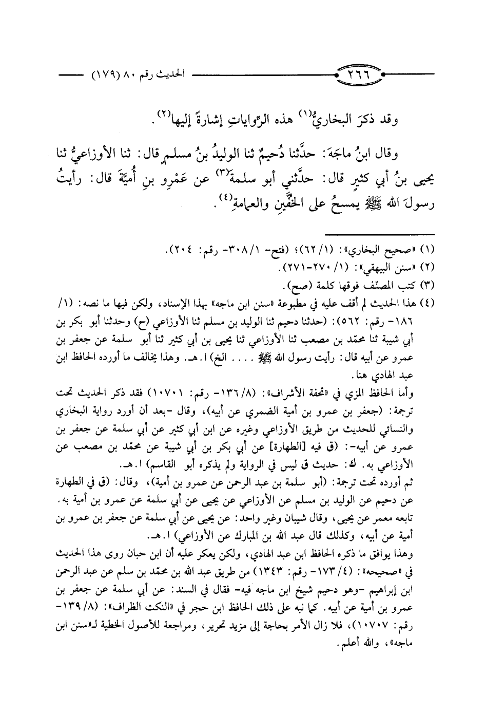 وَقَالَ ابْنُ مَاجَهْ: حَدَّثَنَا دُحَيْمٌ، ثَنَا الْوَلِيدُ بْنُ مُسْلِمٍ، قَالَ: ثَنَا الأَوْزَاعِيُّ، ثَنَا يَحْيَى بْنُ أَبِي كَثِيرٍ، قَالَ: حَدَّثَنِي أَبُو سَلَمَةَ، عَنْ عَمْرِو بْنِ أُمَيَّةَ، قَالَ: رَأَيْتُ رَسُولَ اللَّهِ صَلَّى اللَّهُ عَلَيْهِ وَسَلَّمَ يَمْسَحُ عَلَى الْخُفَّيْنِ وَالْعِمَامَةِ.
