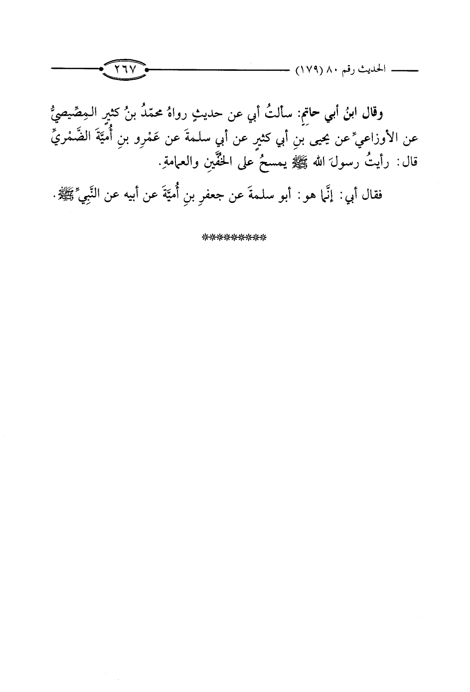 وَقَالَ ابْنُ أَبِي حَاتِمٍ: سَأَلْتُ أَبِي عَنْ حَدِيثٍ رَوَاهُ مُحَمَّدُ بْنُ كَثِيرٍ الْمِصِّيصِيُّ، عَنْ الأَوْزَاعِيِّ، عَنْ يَحْيَى بْنِ أَبِي كَثِيرٍ، عَنْ أَبِي سَلَمَةَ، عَنْ عَمْرِو بْنِ أُمَيَّةَ الضَّمْرِيِّ، قَالَ: رَأَيْتُ رَسُولَ اللَّهِ صَلَّى اللَّهُ عَلَيْهِ وَسَلَّمَ يَمْسَحُ عَلَى الْخُفَّيْنِ وَالْعِمَامَةِ.