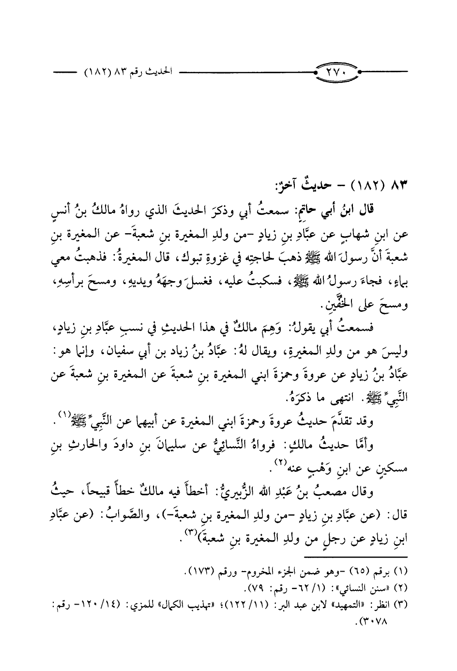 قَالَ ابْنُ أَبِي حَاتِمٍ: سَمِعْتُ أَبِي وَذَكَرَ الْحَدِيثَ الَّذِي رَوَاهُ مَالِكُ بْنُ أَنَسٍ، عَنِ ابْنِ شِهَابٍ، عَنْ عَبَّادِ بْنِ زِيَادٍ مِنْ وَلَدِ الْمُغِيرَةِ بْنِ شُعْبَةَ، عَنْ الْمُغِيرَةِ بْنِ شُعْبَةَ، أَنَّ رَسُولَ اللَّهِ صَلَّى اللَّهُ عَلَيْهِ وَسَلَّمَ ذَهَبَ لِحَاجَتِهِ فِي غَزْوَةِ تَبُوكَ، قَالَ الْمُغِيرَةُ: فَذَهَبْتُ مَعَهُ بِمَاءٍ، فَجَاءَ رَسُولُ اللَّهِ صَلَّى اللَّهُ عَلَيْهِ وَسَلَّمَ، فَسَكَبْتُ عَلَيْهِ، فَغَسَلَ وَجْهَهُ وَيَدَيْهِ، وَمَسَحَ بِرَأْسِهِ، وَمَسَحَ عَلَى الْخُفَّيْنِ.