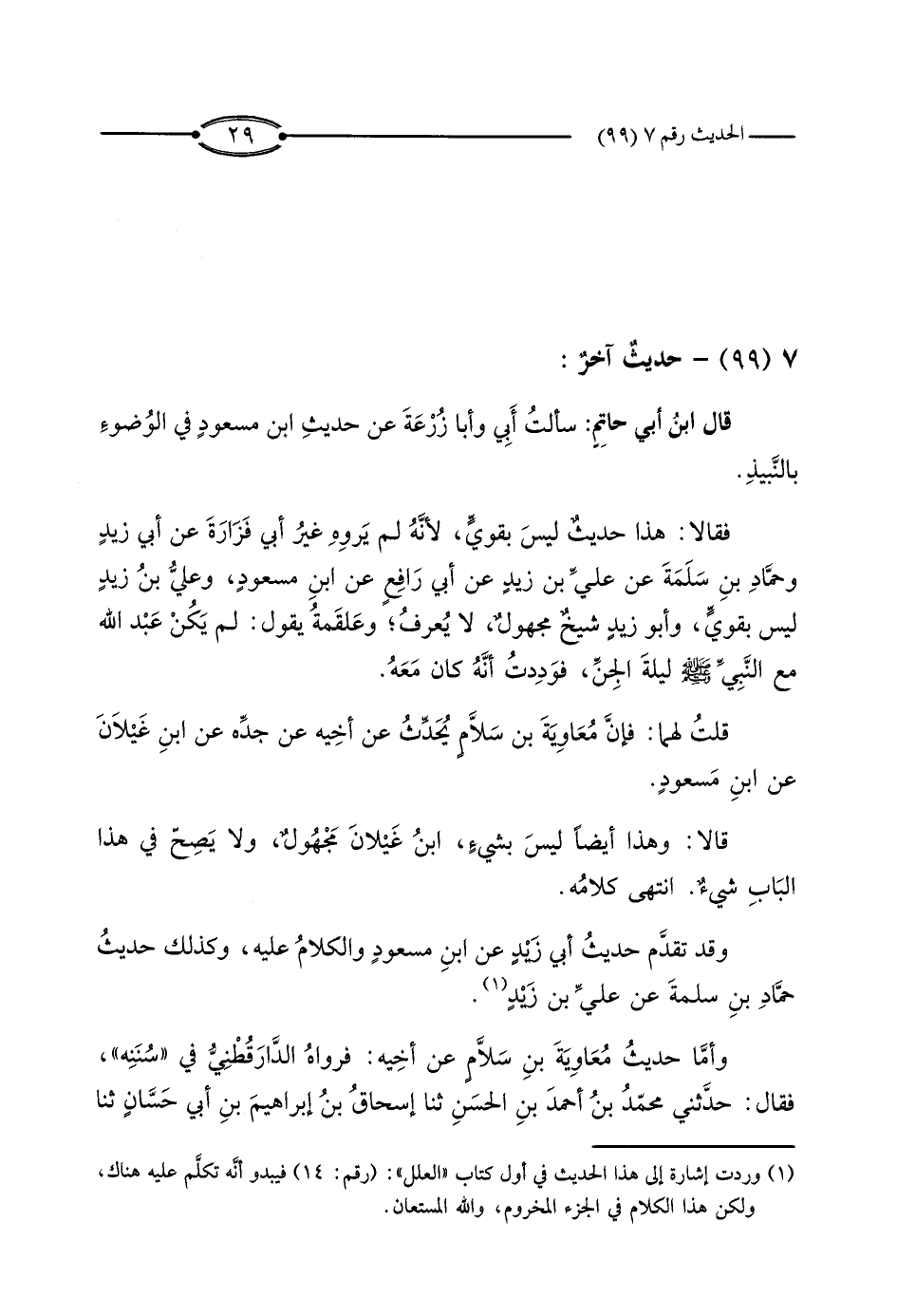 (99) - حَدِيثٌ آخَرُ: قَالَ ابْنُ أَبِي حَاتِمٍ: سَأَلْتُ أَبِي، وَأَبَا زُرْعَةَ، عَنْ حَدِيثِ ابْنِ مَسْعُودٍ فِي الْوُضُوءِ بِالنَّبِيذِ.