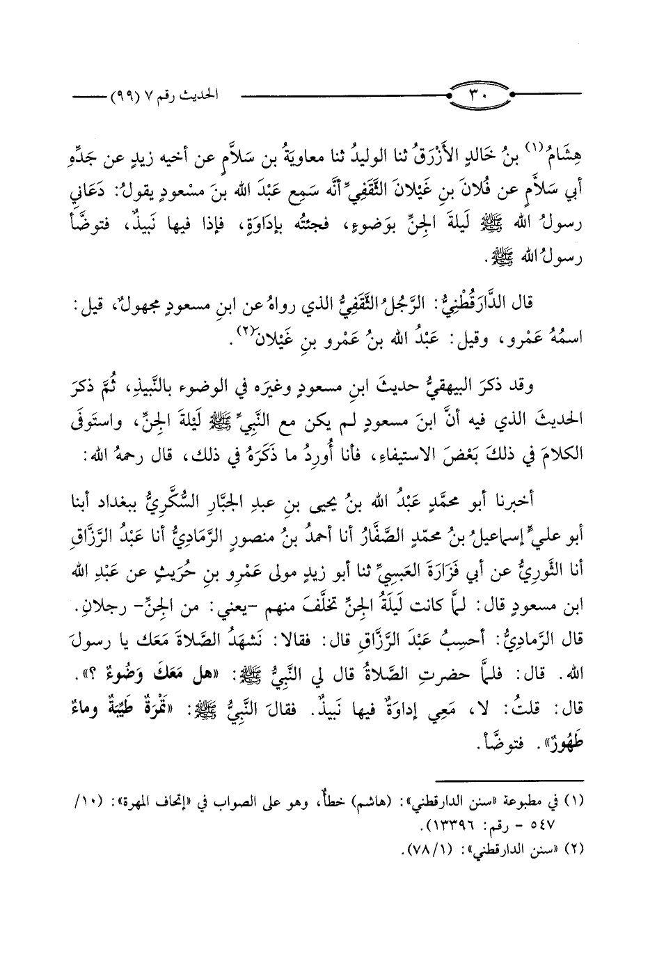 وَقَدْ ذَكَرَ الْبَيْهَقِيُّ حَدِيثَ ابْنِ مَسْعُودٍ وَغَيْرِهِ فِي الْوُضُوءِ بِالنَّبِيذِ، ثُمَّ ذَكَرَ الْحَدِيثَ الَّذِي فِيهِ أَنَّ ابْنَ مَسْعُودٍ لَمْ يَكُنْ مَعَ النَّبِيِّ صَلَّى اللَّهُ عَلَيْهِ وَسَلَّمَ لَيْلَةَ الْجِنِّ، وَاسْتَوْفَى الْكَلامَ فِي ذَلِكَ بَعْضَ الاسْتِيفَاءِ، فَأَنَا أُورِدُ مَا ذَكَرَهُ فِي ذَلِكَ، قَالَ رَحِمَهُ اللَّهُ: أَخْبَرَنَا أَبُو مُحَمَّدٍ عَبْدُ اللَّهِ بْنُ يَحْيَى بْنِ عَبْدِ الْجَبَّارِ السُّكَّرِيُّ بِبِغْدَادَ، أَبْنَا أَبُو عَلِيٍّ إِسْمَاعِيلُ بْنُ مُحَمَّدٍ الصَّفَّارُ، أَنَا أَحْمَدُ بْنُ مَنْصُورٍ الرَّمَادِيُّ، أَنَا عَبْدُ الرَّزَّاقِ، أَنَا الثَّوْرِيُّ، عَنْ أَبِي فَزَارَةَ الْعَبْسِيِّ، ثَنَا أَبُو زَيْدٍ مَوْلَى عَمْرِو بْنِ حُرَيْثٍ، عَنْ عَبْدِ اللَّهِ بْنِ مَسْعُودٍ، قَالَ: لَمَّا كَانَتْ لَيْلَةُ الْجِنِّ تَخَلَّفَ مِنْهُمْ - يَعْنِي: مِنَ الْجِنِّ - رَجُلانِ.