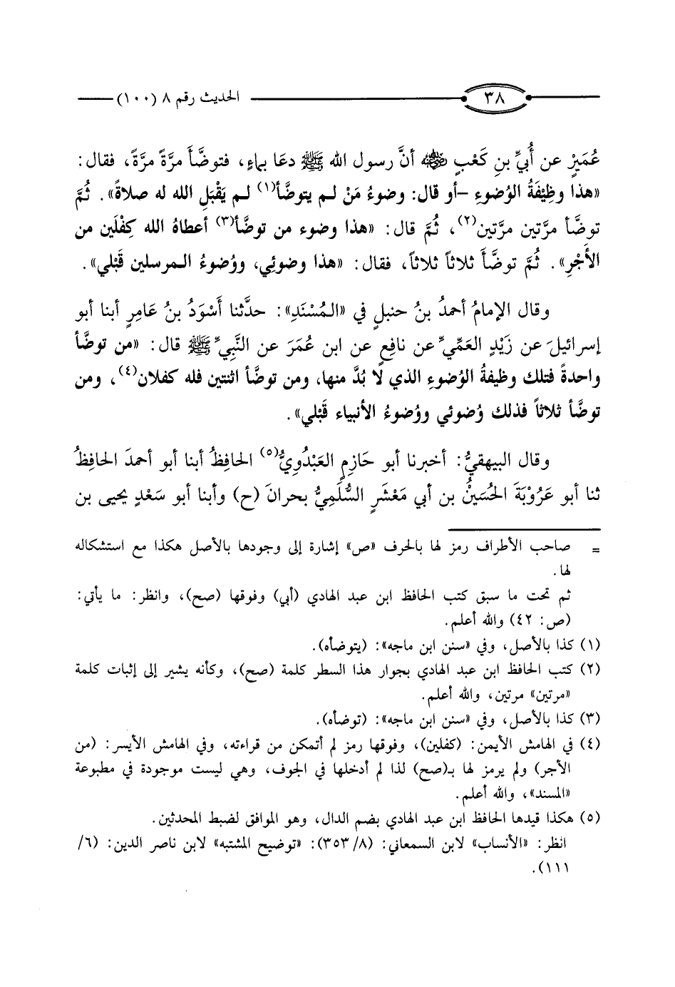 عُمَيْرٍ، عَنْ أُبَيِّ بْنِ كَعْبٍ رَضِيَ اللَّهُ عَنْهُ، أَنَّ رَسُولَ اللَّهِ صَلَّى اللَّهُ عَلَيْهِ وَسَلَّمَ دَعَا بِمَاءٍ، فَتَوَضَّأَ مَرَّةً مَرَّةً، فَقَالَ: " هَذَا وَظِيفَةُ الْوُضُوءِ ـ أَوْ قَالَ: وُضُوءُ مَنْ لَمْ يَتَوَضَّأْهُ لَمْ يَقْبِلِ اللَّهُ لَهُ صَلاةً ".