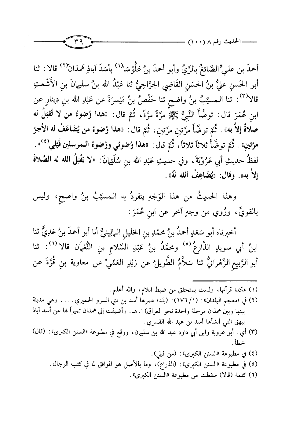 أَحْمَدَ بْنِ عَلِيٍّ الصَّائِغُ بِالرَّيِّ، وَأَبُو أَحْمَدَ بْنُ علوسا بِأَسَدَ آبَاذِ هَمَذَانَ، قَالا: ثَنَا أَبُو الْحَسَنِ عَلِيُّ بْنُ الْحَسَنِ الْقَاضِي الْجَرَّاحِيُّ، ثَنَا عَبْدُ اللَّهِ بْنُ سُلَيْمَانَ بْنِ الأَشْعَثِ، قَالا: ثَنَا الْمُسَيِّبُ بْنُ وَاضِحٍ، ثَنَا حَفْصُ بْنُ مَيْسَرَةَ، عَنْ عَبْدِ اللَّهِ بْنِ دِينَارٍ، عَنْ ابْنِ عُمَرَ، قَالَ: تَوَضَّأَ النَّبِيُّ صَلَّى اللَّهُ عَلَيْهِ وَسَلَّمَ مَرَّةً مَرَّةً، ثُمَّ قَالَ: «هَذَا وُضُوءُ مَنْ لا تُقْبَلُ لَهُ صَلاةٌ إِلا بِهِ» .