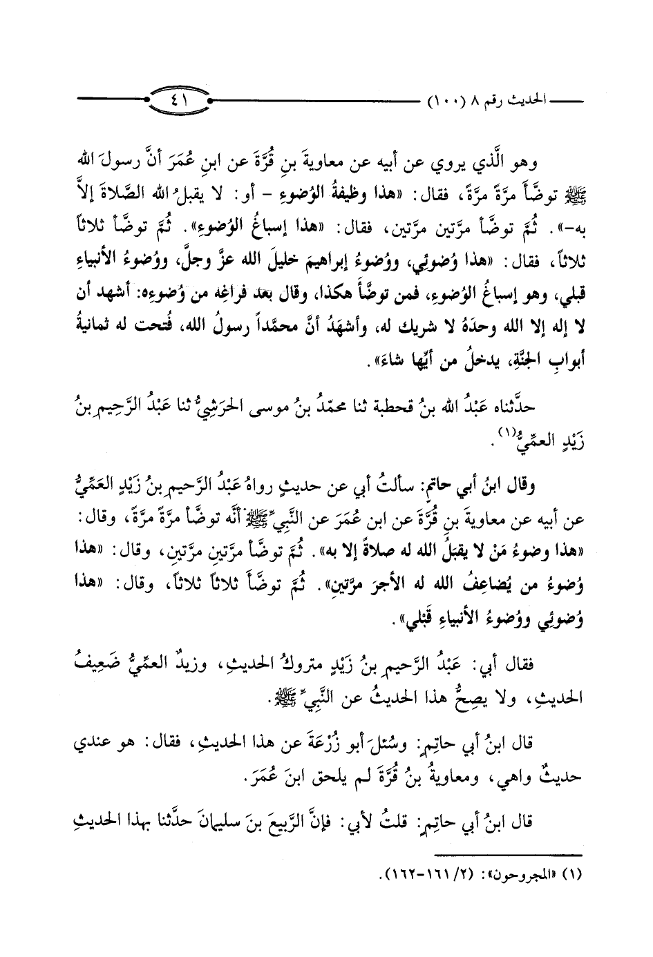 وَقَالَ ابْنُ أَبِي حَاتِمٍ: سَأَلْتُ أَبِي عَنْ حَدِيثٍ رَوَاهُ عَبْدُ الرَّحِيمِ بْنُ زَيْدٍ الْعَمِّيُّ، عَنْ أَبِيهِ، عَنْ مُعَاوِيَةَ بْنِ قُرَّةَ، عَنِ ابْنِ عُمَرَ عَنِ النَّبِيِّ صَلَّى اللَّهُ عَلَيْهِ وَسَلَّمَ، أَنَّهُ تَوَضَّأَ مَرَّةً مَرَّةً، وَقَالَ: «هَذَا وُضُوءُ مَنْ لا يَقْبَلُ اللَّهُ صَلاةً إِلا بِهِ» .
