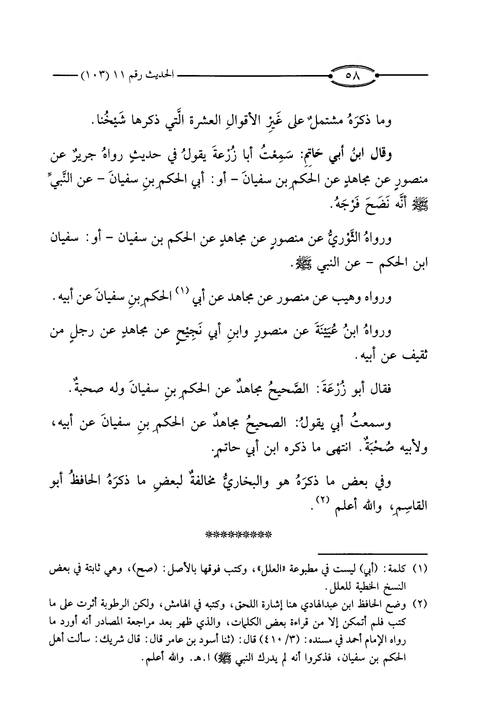 وَقَالَ ابْنُ أَبِي حَاتِمٍ: سَمِعْتُ أَبَا زُرْعَةَ يَقُولُ فِي حَدِيثٍ رَوَاهُ جَرِيرٌ، عَنْ مَنْصُورٍ، عَنْ مُجَاهِدٍ، عَنْ الْحَكَمِ بْنِ سُفْيَانَ - أَوْ: أَبِي الْحَكَمِ بْنِ سُفْيَانَ، - عَنِ النَّبِيِّ صَلَّى اللَّهُ عَلَيْهِ وَسَلَّمَ أَنَّهُ نَضَحَ فَرْجَهُ.