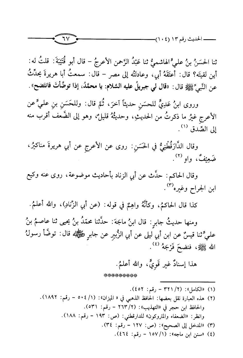 ثَنَا الْحَسَنُ بْنُ عَلِيٍّ الْهَاشِمِيُّ، ثَنَا عَبْدُ الرَّحْمَنِ الأَعْرَجُ، قَالَ أَبُو قُتَيْبَةَ: قُلْتُ لَهُ: أَيْنَ لَقِيتُهُ؟ قَالَ: أَعْتَقَهُ أَبِي، وَعَادَلْتُهُ إِلَى مِصْرَ - قَالَ: سَمِعْتُ أَبَا هُرَيْرَةَ يُحَدِّثُ عَنِ النَّبِيِّ صَلَّى اللَّهُ عَلَيْهِ وَسَلَّمَ قَالَ: " قَالَ لِي جِبْرِيلُ عَلَيْهِ السَّلامَ: يَا مُحَمَّدُ، إِذَا تَوَضَّأْتَ فَانْتَضِحْ ".
