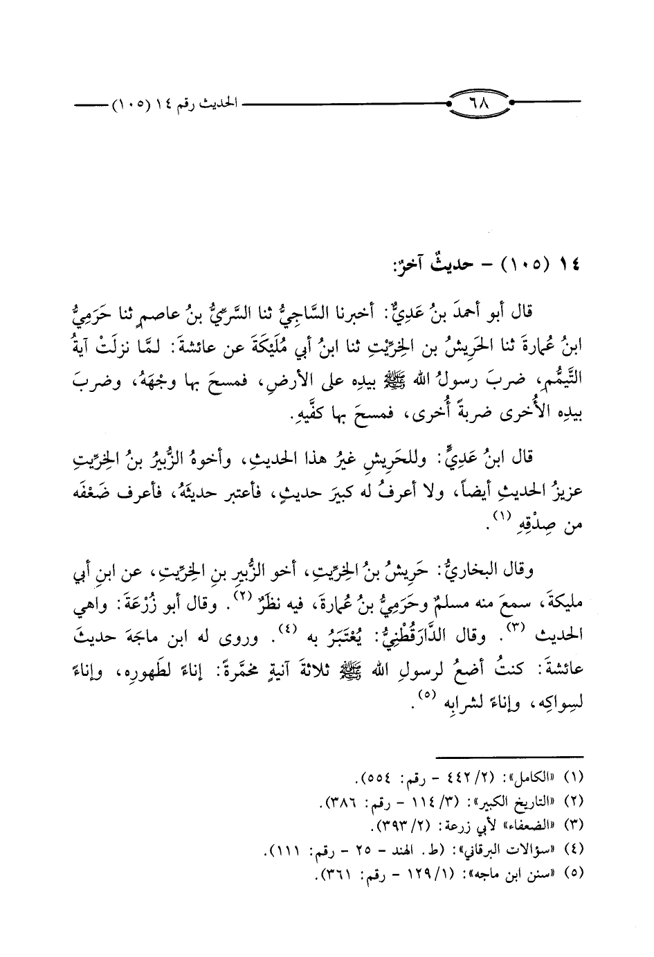قَالَ أَبُو أَحْمَدَ بْنُ عَدِيٍّ: أَخْبَرَنَا السَّاجِيُّ، ثَنَا السُّرِّيُّ بْنُ عَاصِمٍ، ثَنَا حَرَمِيُّ بْنُ عُمَارَةَ، ثَنَا الْحَرِيشُ بْنُ الْخِّرِّيتِ، ثَنَا ابْنُ أَبِي مُلَيْكَةَ، عَنْ عَائِشَةَ: لَمَّا نَزَلَتْ آيَةُ التَّيَمُّمِ، ضَرَبَ رَسُولُ اللَّهِ صَلَّى اللَّهُ عَلَيْهِ وَسَلَّمَ بِيَدِهِ عَلَى الأَرْضِ، فَمَسَحَ بِهِا وَجِهَهُ، وَضَرَبَ بِيَدِهِ الأُخْرَى ضَرْبَةً أُخْرَى، فَمَسَحَ بِهَا كَفَّيْهِ.