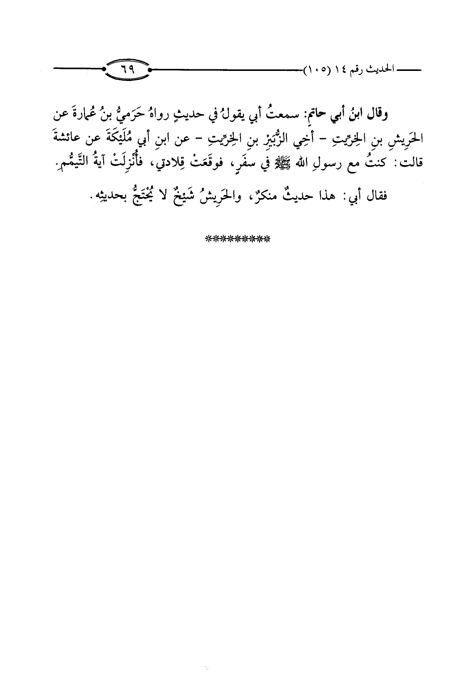 وَقَالَ ابْنُ أَبِي حَاتِمٍ: سَمِعْتُ أَبِي، يَقُولُ فِي حَدِيثٍ رَوَاهُ حَرَمِيُّ بْنُ عُمَارَةَ، عَنِ الْحَرِيشِ بْنِ الْخِرِّيتِ - أَخِي الزُّبَيْرِ بْنِ الْخِرِّيتِ -، عَنِ ابْنِ أَبِي مُلَيْكَةَ،: عَنْ عَائِشَةَ، قَالَتْ: كُنْتُ مَعَ رَسُولِ اللَّهِ صَلَّى اللَّهُ عَلَيْهِ وَسَلَّمَ فِي سَفَرٍ، فَوَقَعَتْ قِلَادَتِي، فَأُنْزِلَتْ آيَةُ التَّيَمُّمِ.