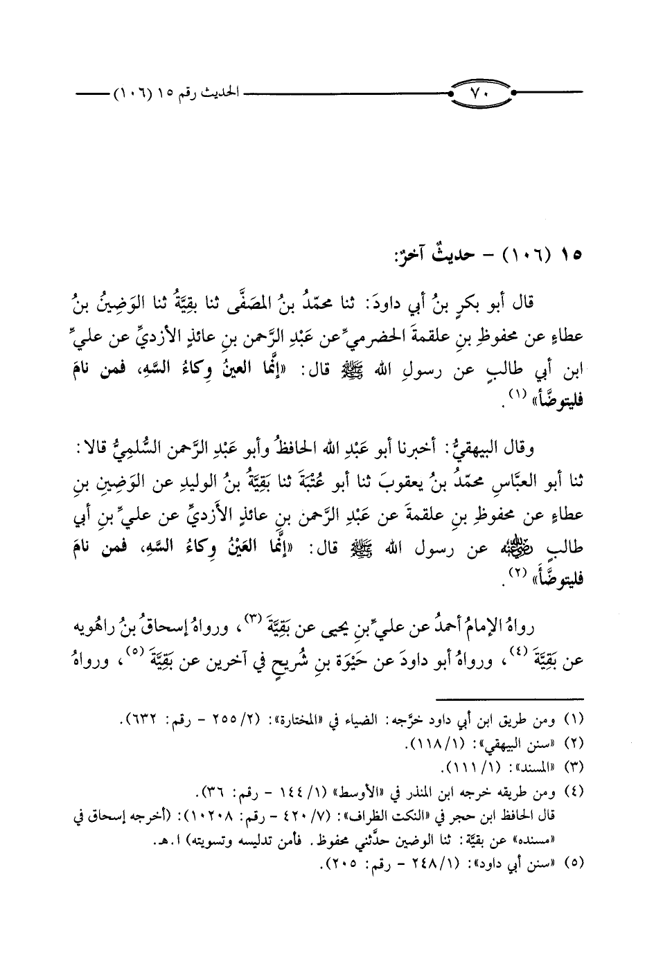 قَالَ أَبُو بَكْرِ بْنُ أَبِي دَاوُدَ: ثَنَا مُحَمَّدُ بْنُ الْمُصَفَّى، ثَنَا بَقِيَّةُ، ثَنَا الْوَضِينُ بْنُ عَطَاءٍ، عَنْ مَحْفُوظِ بْنِ عَلْقَمَةَ الْحَضْرَمِيِّ، عَنْ عَبْدِ الرَّحْمَنِ بْنِ عَائِذٍ الأَزْدِيِّ، عَنْ عَلِيِّ بْنِ أَبِي طَالِبٍ، عَنْ رَسُولِ اللَّهِ صَلَّى اللَّهُ عَلَيْهِ وَسَلَّمَ قَالَ: إِنَّمَا الْعَيْنُ وِكَاءُ السَّهِ، فَمَنْ نَامَ فَلْيَتَوَضَّأْ ".