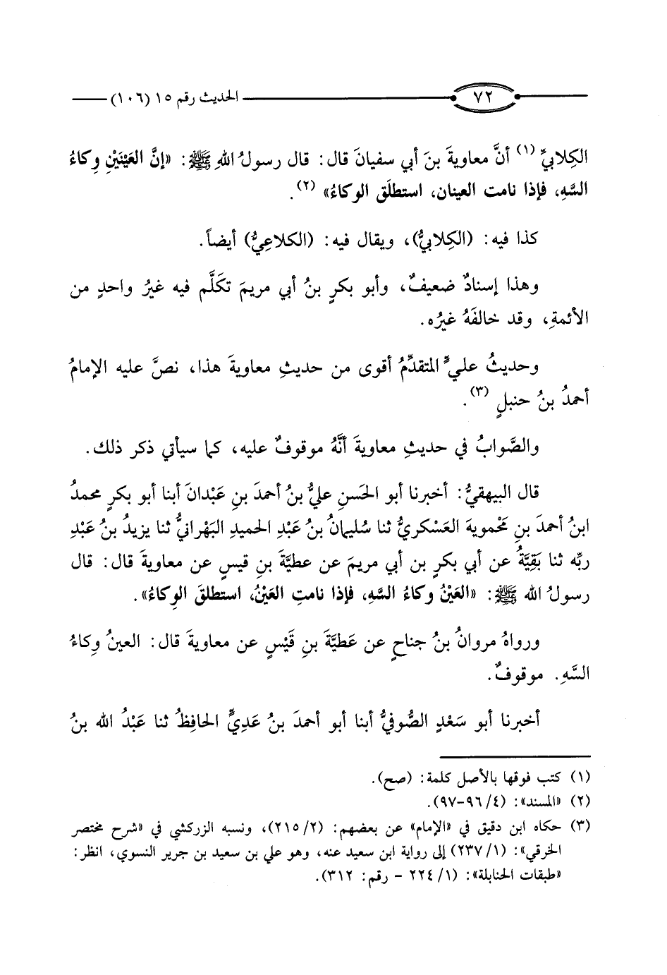 وَحَدِيثُ عَلِيٍّ الْمُتَقَدِّمُ أَقْوَى مِنْ حَدِيثِ مُعَاوِيَةَ هَذَا، نَصَّ عَلَيْهِ الإِمَامُ أَحْمَدُ بْنُ حَنْبَلٍ.