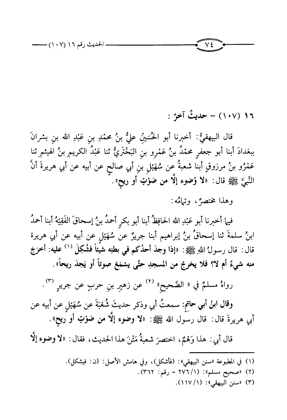 وَهَذَا مُخْتَصَرٌ، وَتَمَامُهُ: فِيمَا أَخْبَرَنَا أَبُو عَبْدِ اللَّهِ الْحَافِظُ، أَبْنَا أَبُو بَكْرٍ أَحْمَدُ بْنُ إِسْحَاقَ الْفَقِيهُ، أَبْنَا أَحْمَدُ بْنُ سَلَمَةَ، ثَنَا إِسْحَاقُ بْنُ إِبْرَاهِيمَ، أَبْنَا جَرِيرٌ، عَنْ سُهَيْلٍ، عَنْ أَبِيهِ، عَنْ أَبِي هُرَيْرَةَ، قَالَ: قَالَ رَسُولُ اللَّهِ صَلَّى اللَّهُ عَلَيْهِ وَسَلَّمَ: " إِذَا وَجَدَ أَحَدُكُمْ فِي بَطْنِهِ شَيْئًا فَأَشْكَلَ عَلَيْهِ: أَخْرَجَ مِنْهُ شَيْءٌ أَمْ لا؟ فَلا يَخْرُجْ مِنَ الْمَسْجِدِ حَتَّى يَسْمَعَ صَوْتًا أَوْ يَجِدَ رِيحًا ".