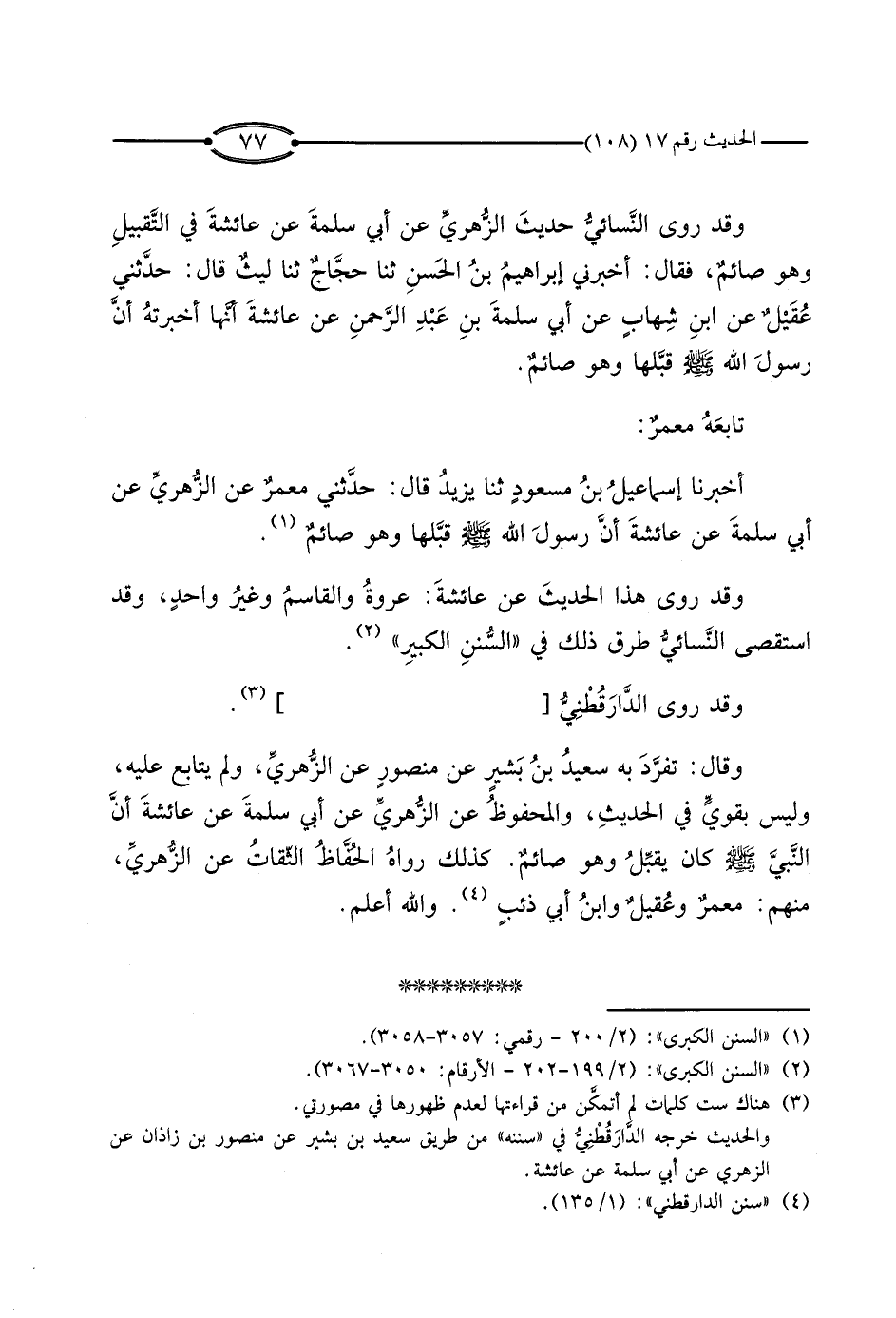 وَقَدْ رَوَى النِّسَائِيُّ حَدِيثَ الزُّهْرِيِّ، عَنْ أَبِي سَلَمَةَ، عَنْ عَائِشَةَ فِي التَّقْبِيلِ وَهُوَ صَائِمٌ، فَقَالَ: أَخْبَرَنِي إِبْرَاهِيمُ بْنُ الْحَسَنِ، ثَنَا حَجَّاجٌ، ثَنَا لَيْثٌ، قَالَ: حَدَّثَنِي عُقَيْلٌ، عَنْ ابْنِ شِهَابٍ، عَنْ أَبِي سَلَمَةَ بْنِ عَبْدِ الرَّحْمَنِ، عَنْ عَائِشَةَ، أَنَّهَا أَخْبَرَتْهُ أَنَّ رَسُولَ اللَّهِ صَلَّى اللَّهُ عَلَيْهِ وَسَلَّمَ قَبَّلَهَا وَهُوَ صَائِمٌ.