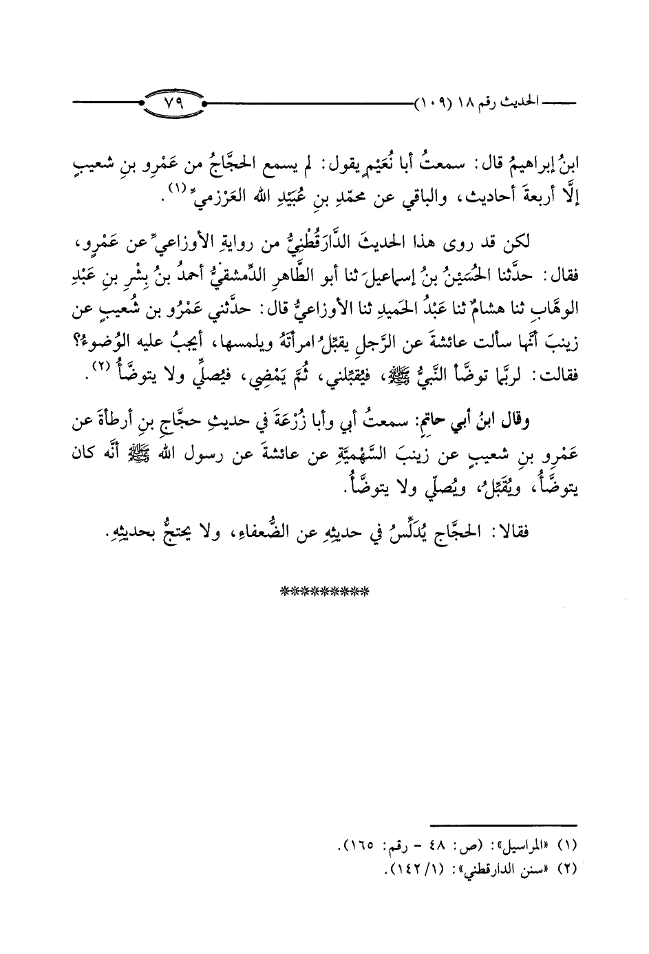 وَقَالَ ابْنُ أَبِي حَاتِمٍ: سَمِعْتُ أَبِي، وَأَبَا زُرْعَةَ، فِي حَدِيثِ حَجَّاجِ بْنِ أَرْطَأَةَ، عَنْ عَمْرِو بْنِ شُعَيْبٍ، عَنْ زَيْنَبَ السَّهْمِيَّةِ، عَنْ عَائِشَةَ، عَنْ رَسُولِ اللَّهِ صَلَّى اللَّهُ عَلَيْهِ وَسَلَّمَ أَنَّهُ كَانَ يَتَوَضَّأُ، وَيُقَبِّلُ، وَيُصَلِّي وَلا يَتَوَضَّأُ.