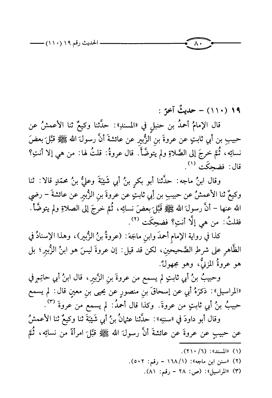 قَالَ الإِمَامُ أَحْمَدُ بْنُ حَنْبَلٍ فِي «الْمُسْنَدِ» : حَدَّثَنَا وَكِيعٌ، ثَنَا الأَعْمَشُ، عَنْ حَبِيبِ بْنِ أَبِي ثَابِتٍ، عَنْ عُرْوَةَ بْنِ الزُّبَيْرِ، عَنْ عَائِشَةَ، أَنَّ رَسُولَ اللَّهِ صَلَّى اللَّهُ عَلَيْهِ وَسَلَّمَ قَبَّلَ بَعْضَ نِسَائِهِ، ثُمَّ خَرَجَ إِلَى الصَّلاةِ وَلَمْ يَتَوَضَّأْ.