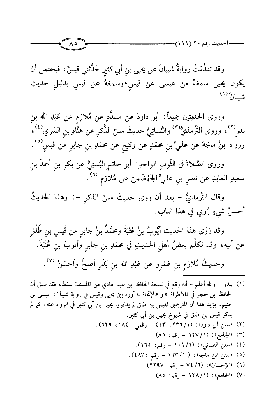 وَرَوَى الْحَدِيثَيْنِ جَمِيعًا أَبُو دَاوُدَ، عَنْ مُسَدَّدٍ، عَنْ مُلازِمٍ، عَنْ عَبْدِ اللَّهِ بْنِ بَدْرٍ، وَرَوَى التِّرْمِذِيُّ، وَالنَّسَائِيُّ، حَدِيثَ مَسِّ الذَّكَرِ عَنْ هَنَّادِ بْنِ السَّرِيِّ، وَرَوَاهُ ابْنُ مَاجَهْ، عَنْ عَلِيِّ بْنِ مُحَمَّدٍ، عَنْ وَكِيعٍ، عَنْ مُحَمَّدِ بْنِ جَابِرٍ، عَنْ قَيْسٍ.