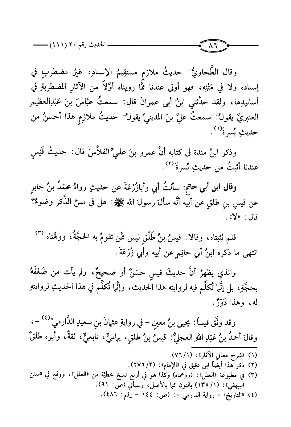 وَقَالَ الطَّحَاوِيُّ: حَدِيثُ مُلازِمٍ مُسْتَقِيمُ الإِسْنَادِ، غَيْرُ مُضْطَرِبٍ فِي إِسْنَادِهِ وَلا فِي مَتْنِهِ، فَهُوَ أَوْلَى عِنْدَنَا مِمَّا رَوَيْنَاهُ أَوَّلا مِنَ الآثَارِ الْمُضْطَرِبَةِ فِي أَسَانِيدِهَا، وَلَقَدْ حَدَّثَنِي ابْنُ أَبِي عِمْرَانَ، قَالَ: سَمِعْتُ عَبَّاسَ بْنَ عَبْدِ الْعَظِيمِ الْعَنْبَرِيَّ، يَقُولُ: سَمِعْتُ عَلِيَّ بْنَ الْمَدِينِيِّ، يَقُولُ: حَدِيثُ مُلازِمٍ هَذَا أَحْسَنُ مِنْ حَدِيثِ بُسْرَةَ.