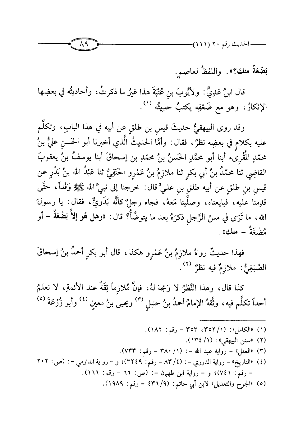 وَقَدْ رَوَى الْبَيْهَقِيُّ حَدِيثَ قَيْسِ بْنِ طَلْقٍ، عَنْ أَبِيهِ، فِي هَذَا الْبَابِ، وَتَكَلَّمَ عَلَيْهِ بِكَلامٍ فِي بَعْضِهِ نَظَرٌ، فَقَالَ: وَأَمَّا الْحَدِيثُ الَّذِي أَخْبَرَنَا أَبُو الْحَسَنِ عَلِيُّ بْنُ مُحَمَّدٍ الْمُقْرِئُ، أَبْنَا أَبُو مُحَمَّدٍ الْحَسَنُ بْنُ مُحَمَّدِ بْنِ إِسْحَاقَ، أَبْنَا يُوسُفُ بْنُ يَعْقُوبَ الْقَاضِي، ثَنَا مُحَمَّدُ بْنُ أَبِي بَكْرٍ، ثَنَا مُلازِمُ بْنُ عَمْرٍو الْحَنَفِيُّ، ثَنَا عَبْدُ اللَّهِ بْنُ بَدْرٍ، عَنْ قَيْسِ بْنِ طَلْقٍ، عَنْ أَبِيهِ طَلْقِ بْنِ عَلِيٍّ، قَالَ: خَرَجْنَا إِلَى نَبِيِّ اللَّهِ صَلَّى اللَّهُ عَلَيْهِ وَسَلَّمَ وَفْدًا، حَتَّى قَدِمْنَا عَلَيْهِ، فَبَايَعْنَاهُ، وَصَلَّيْنَا مَعَهُ، فَجَاءَ رَجُلٌ كَأَنَّهُ بَدَوِيٌّ، فَقَالَ: يَا رَسُولَ اللَّهِ مَا تَرَى فِي مَسِّ الرَّجُلِ ذَكَرَهُ بَعْدَ مَا يَتَوَضَّأُ؟ قَالَ: «وَهَلْ هُوَ إِلا بَضْعَةٌ - أَوْ مُضْغَةٌ - مِنْكَ» .