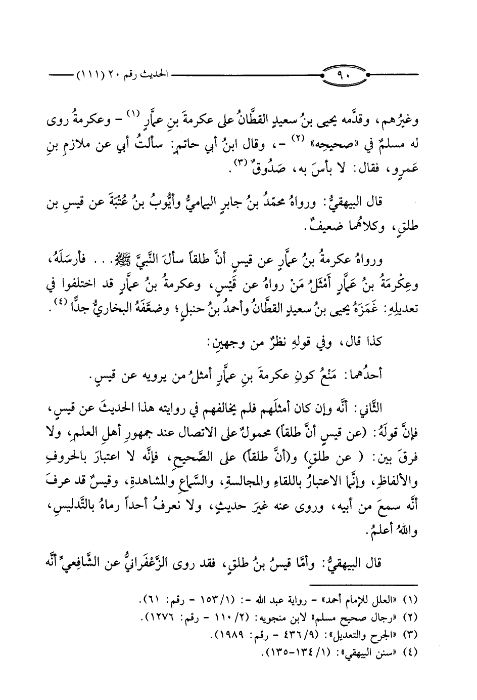 وَرَوَاهُ عِكْرِمَةُ بْنُ عَمَّارٍ، عَنْ قَيْسٍ، أَنَّ طَلْقًا سَأَلَ النَّبِيَّ صَلَّى اللَّهُ عَلَيْهِ وَسَلَّمَ. . . فَأَرْسَلَهُ، وَعِكْرِمَةُ بْنُ عَمَّارٍ أَمْثَلُ مَنْ رَوَاهُ عَنْ قَيْسٍ، وَعِكْرِمَةُ بْنُ عَمَّارٍ قَدِ اخْتَلَفُوا فِي تَعْدِيلِهِ: غَمَزَهُ يَحْيَى بْنُ سَعِيدٍ الْقَطَّانُ، وَأَحْمَدُ بْنُ حَنْبَلٍ، وَضَعَّفَهُ الْبُخَارِيُّ جِدًّا.