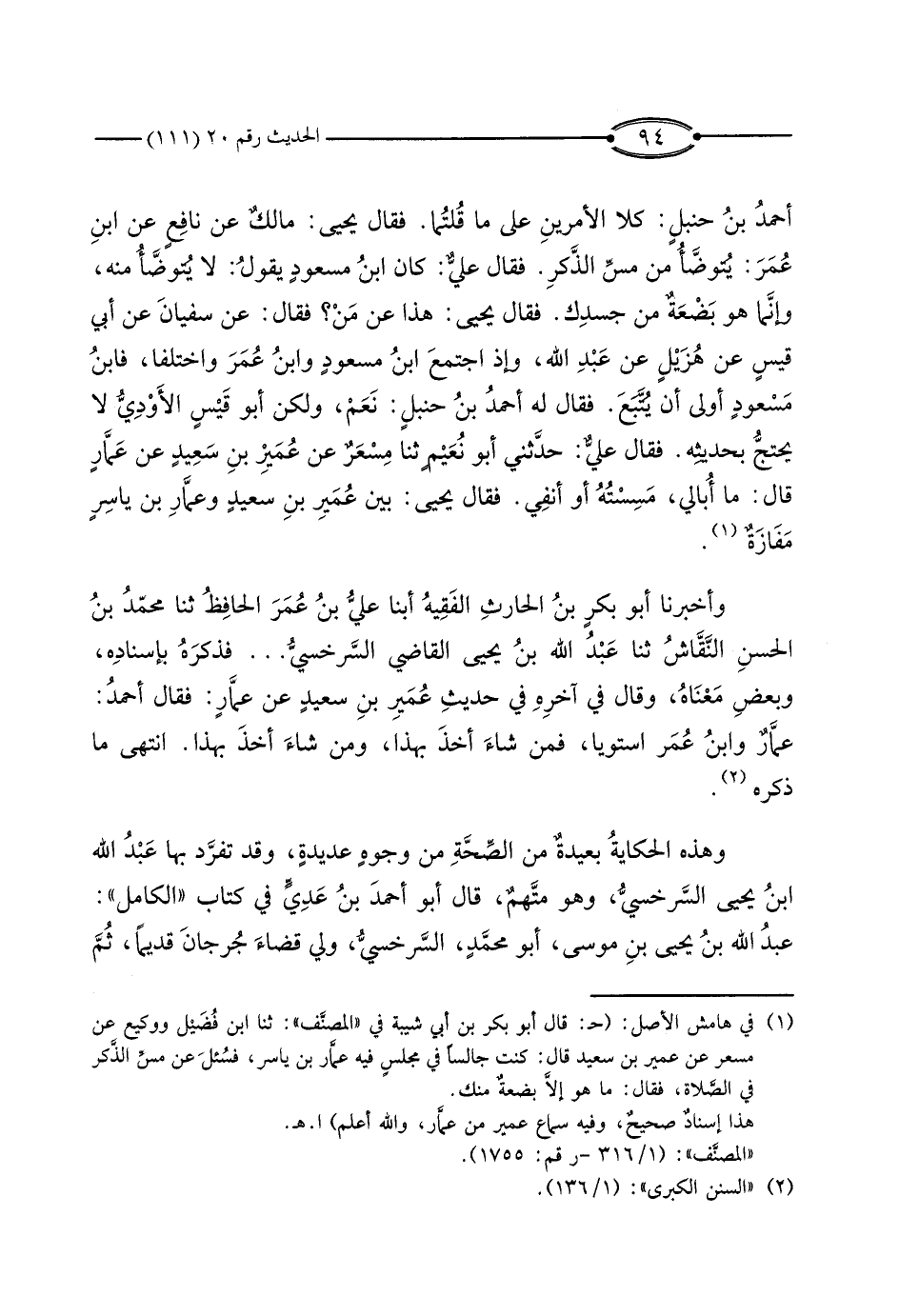 وَأَخْبَرَنَا أَبُو بَكْرِ بْنِ الْحَارِثِ الْفَقِيهُ، أَبْنَا عَلِيُّ بْنُ عُمَرَ الْحَافِظُ، ثَنَا مُحَمَّدُ بْنُ الْحَسَنِ النَّقَّاشُ، ثَنَا عَبْدُ اللَّهِ بْنُ يَحْيَى الْقَاضِي السَّرَخْسِيُّ. . . فَذَكَرَهُ بِإِسْنَادِهِ، وَبَعْضِ مَعْنَاهُ، وَقَالَ فِي آخِرِهِ فِي حَدِيثِ عُمَيْرِ بْنِ سَعِيدٍ، عَنْ عَمَّارٍ،: فَقَالَ أَحْمَدُ: عَمَّارُ وَابْنُ عُمَرَ اسْتَوَيَا، فَمَنْ شَاءَ أَخَذَ بِهَذَا، وَمَنْ شَاءَ أَخَذَ بِهَذَا.
