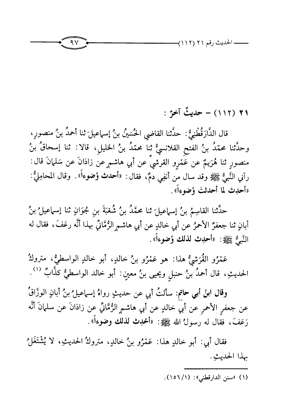 قَالَ الدَّارَقُطْنِيُّ: حَدَّثَنَا الْقَاضِي الْحُسَيْنُ بْنُ إِسْمَاعِيلَ، ثَنَا أَحْمَدُ بْنُ مَنْصُورٍ، وَحَدَّثَنَا مُحَمَّدُ بْنُ الْفَتْحِ الْقَلانِسِيُّ، ثَنَا مُحَمَّدُ بْنُ الْخَلِيلِ، قَالا: ثَنَا إِسْحَاقُ بْنُ مَنْصُورٍ، ثَنَا هُرَيْمٌ، عَنْ عَمْرٍو الْقُرَشِيِّ، عَنْ أَبِي هَاشِمٍ، عَنْ زَاذَانَ، عَنْ سَلْمَانَ، قَالَ: رَآنِي النَّبِيُّ صَلَّى اللَّهُ عَلَيْهِ وَسَلَّمَ وَقَدْ سَالَ مِنْ أَنْفِي دَمٌ، فَقَالَ: «أَحْدِثْ وُضُوءًا» .